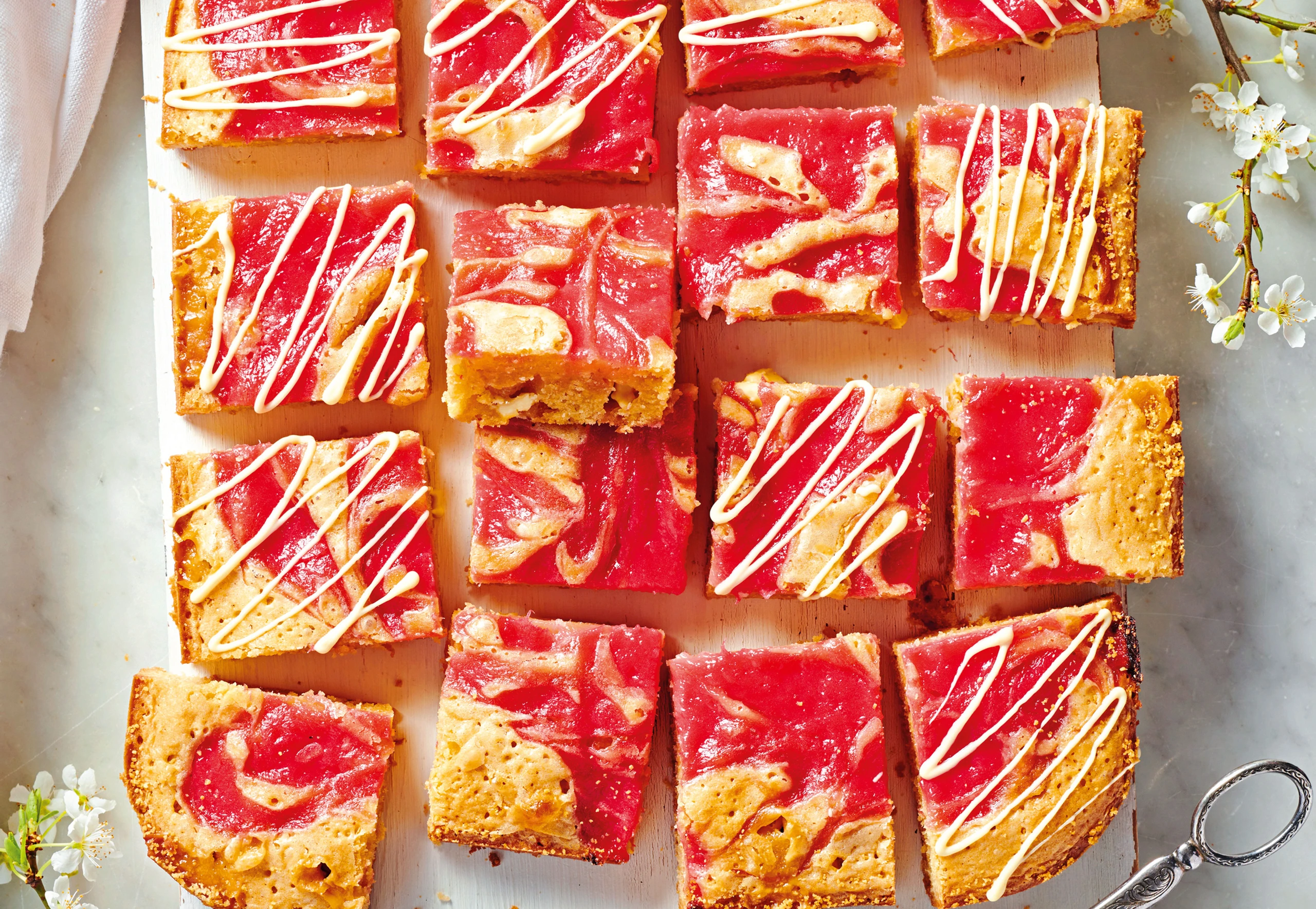 Butter und Zucker erwärmen, bis sich der Zucker aufgelöst hat und die Butter geschmolzen ist. Überkühlen lassen. Eier einzeln unterrühren. Mehl, Stärke und Schokolade untermischen. Masse in die Form füllen und das Rhabarberpüree darauf verteilen. Mit einer Messerspitze marmorieren.