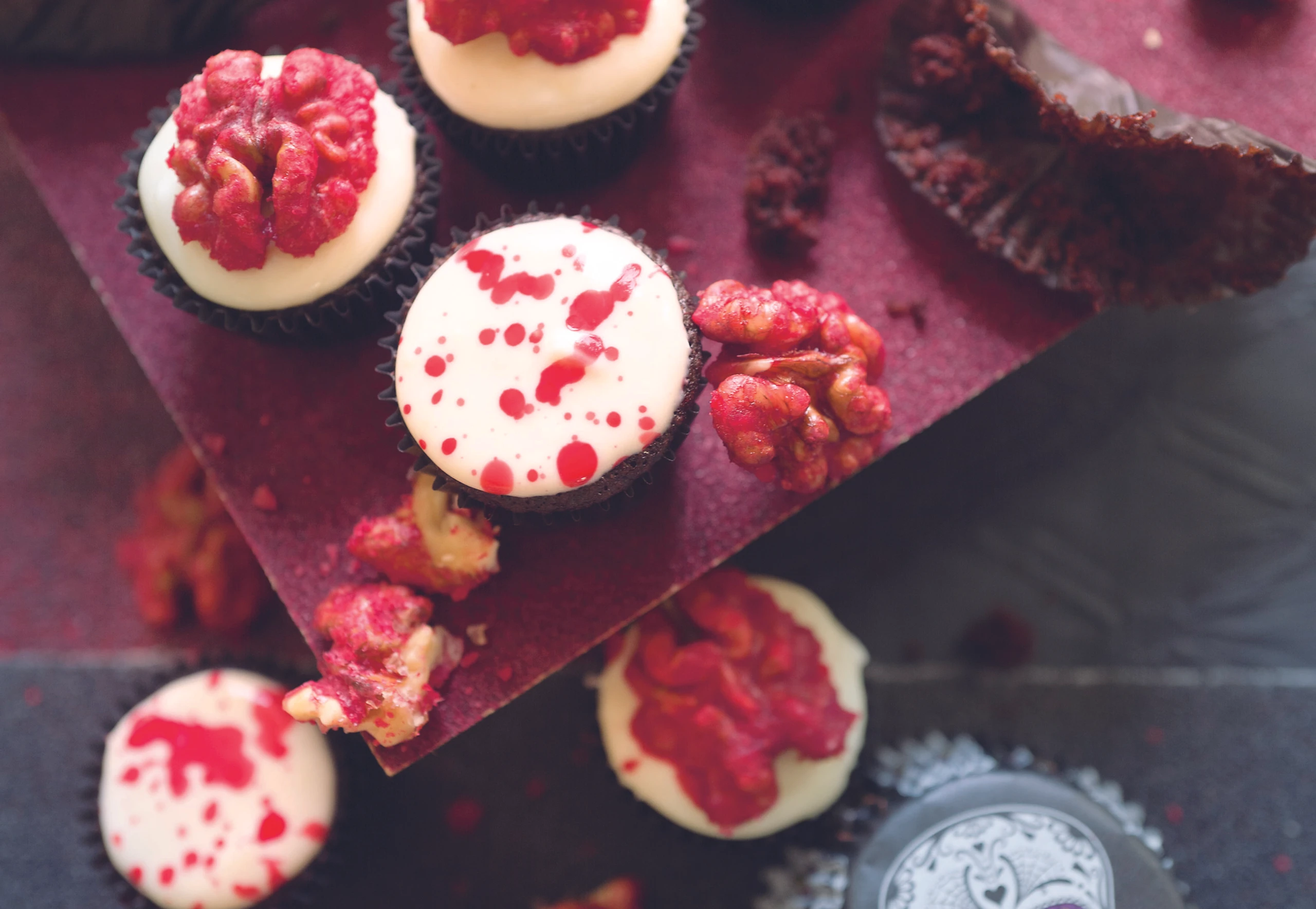 Muffins mit dem Topping bestreichen, mit Nüssen belegen.