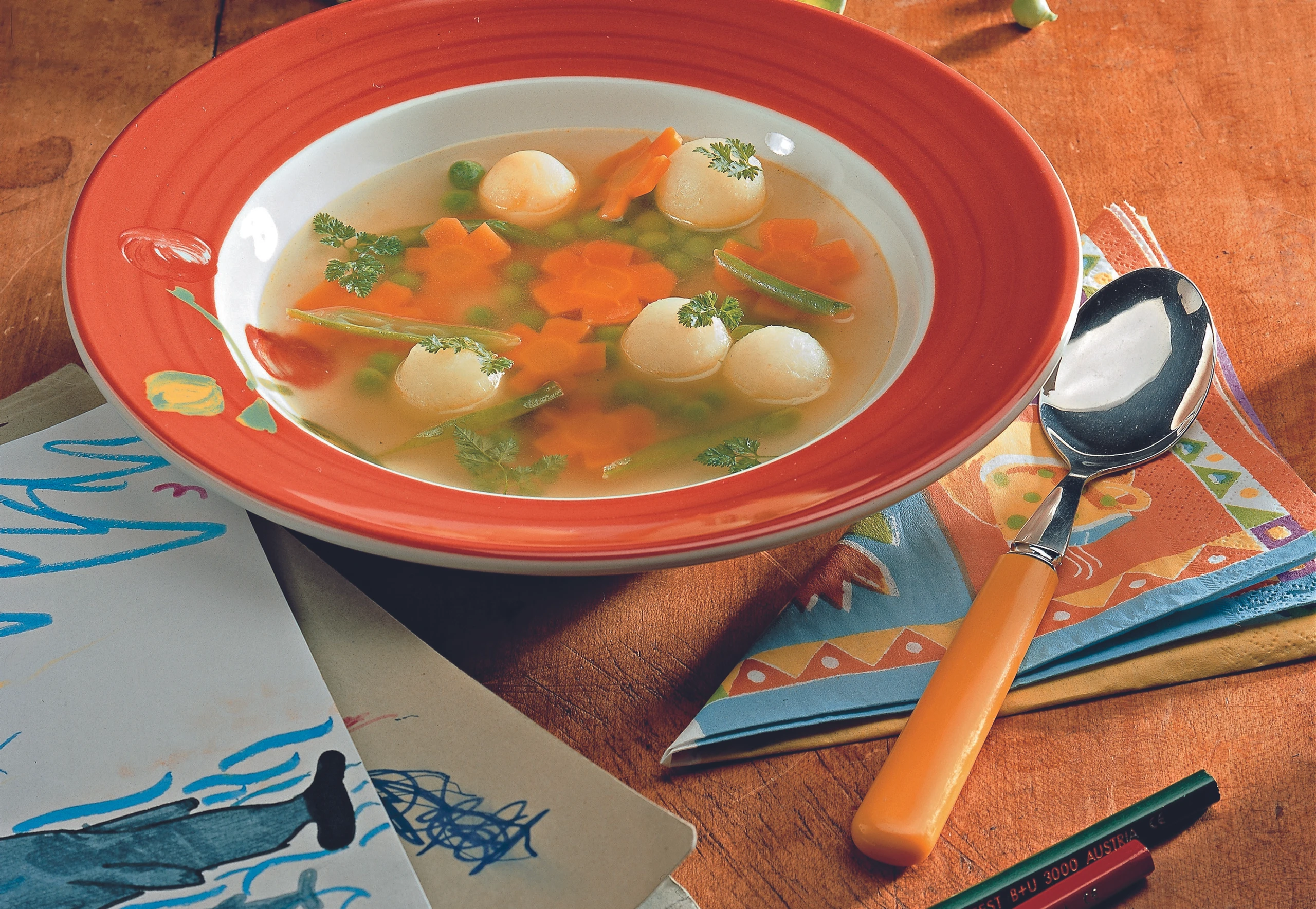 Blümchen-Stäbchen-Kugerl-Gemüsesuppe
