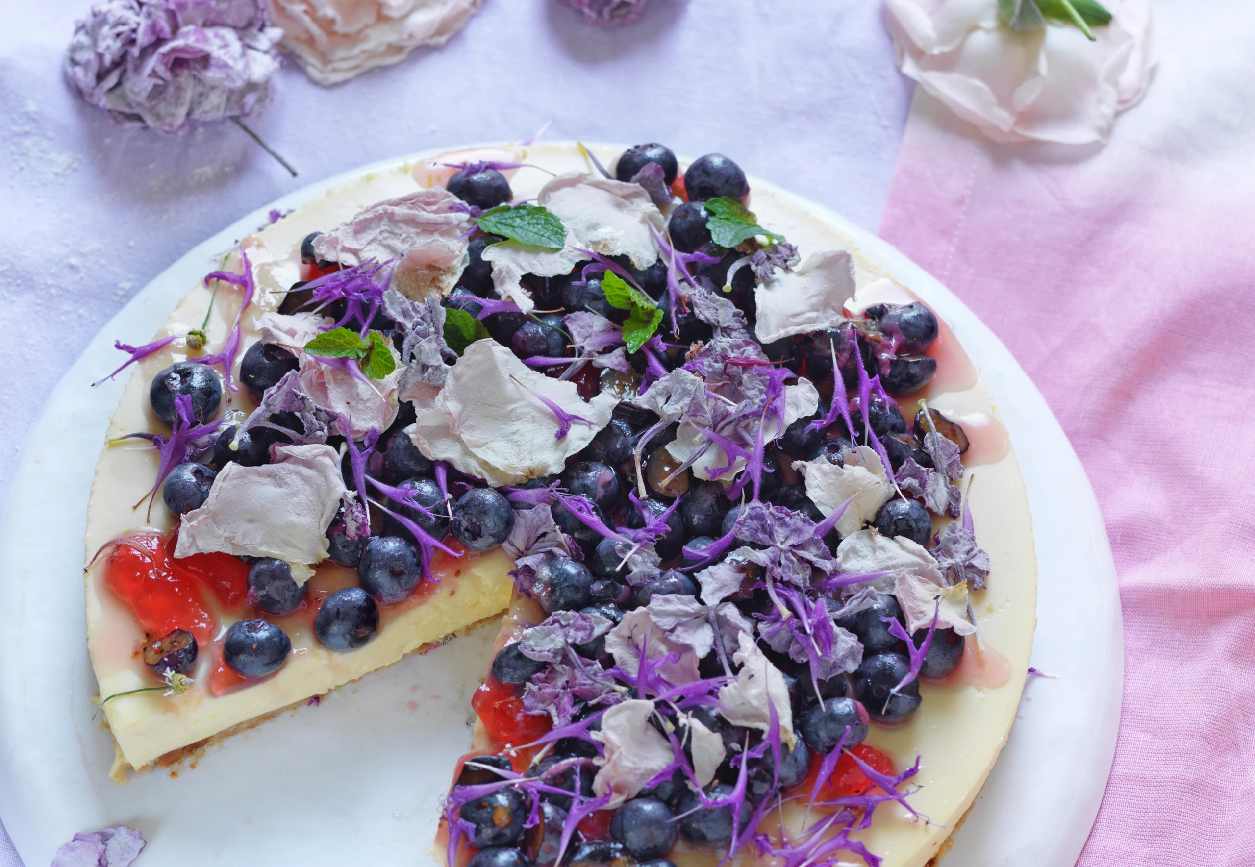 Für den Belag Heidelbeeren verlesen. Torte aus der Form lösen, mit Marmelade bestreichen, mit Heidelbeeren und Blüten garnieren.