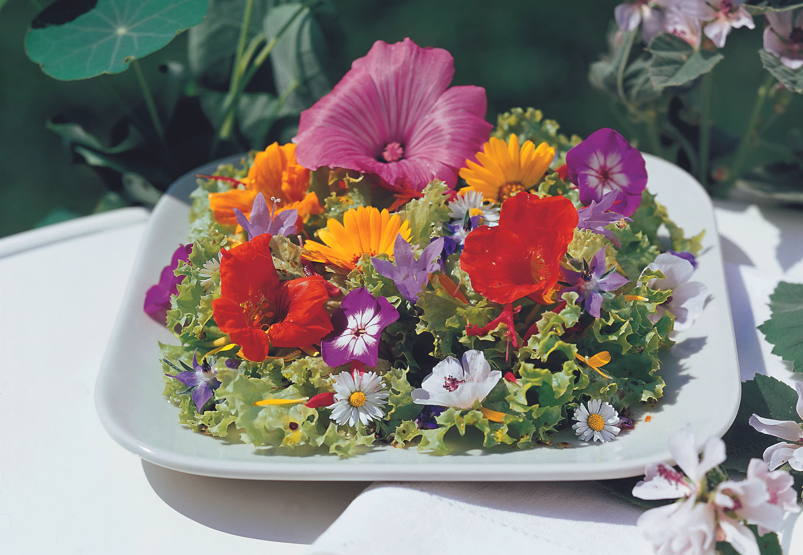 Gusto-Tipp: Kleine und robuste Blüten können zusammen mit dem Salat mariniert werden, zartere sollten erst kurz vor dem Servieren untergemengt bzw. nur über den Salat gestreut werden. Einige Blüten haben mehr dekorativen Wert (z.B. Kornblume), manche schmecken süß (Phlox, Glockenblumen), andere scharf (Kapuzinerkresse).
