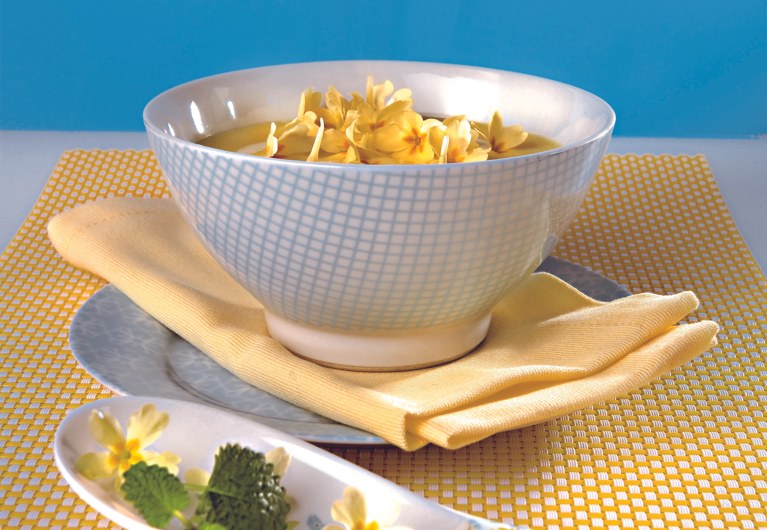 Suppe mit den Schlüsselblumen oder Primeln aufkochen, vom Herd nehmen, zudecken und 10 Minuten ziehen lassen.