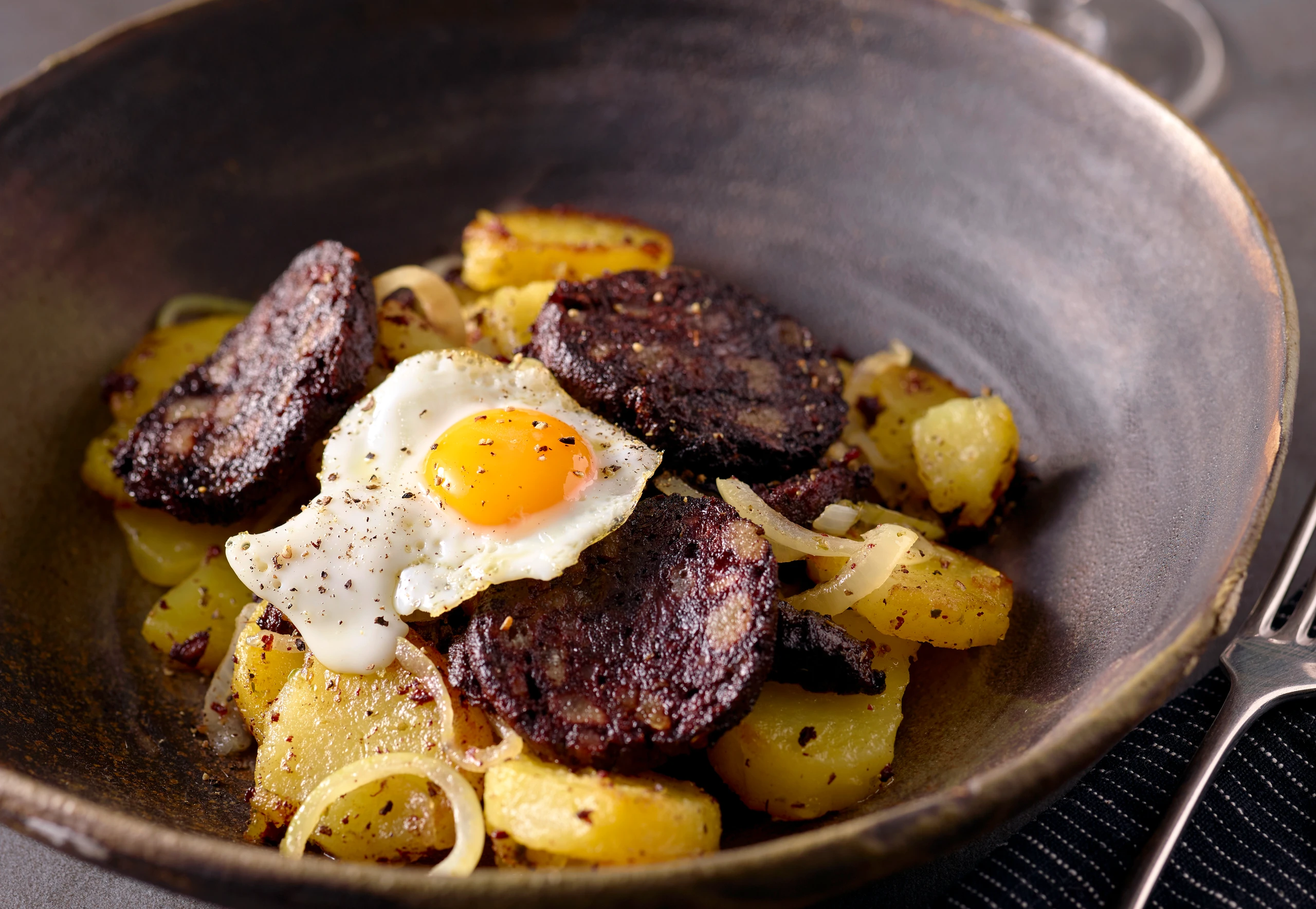 Die Hälfte vom Butterschmalz erhitzen und die Erdäpfel darin beidseitig knusprig braten. Parallel dazu in einer zweiten Pfanne die Hälfte vom Öl erhitzen. Blunzenscheiben beidseitig kurz anbraten und herausnehmen.
