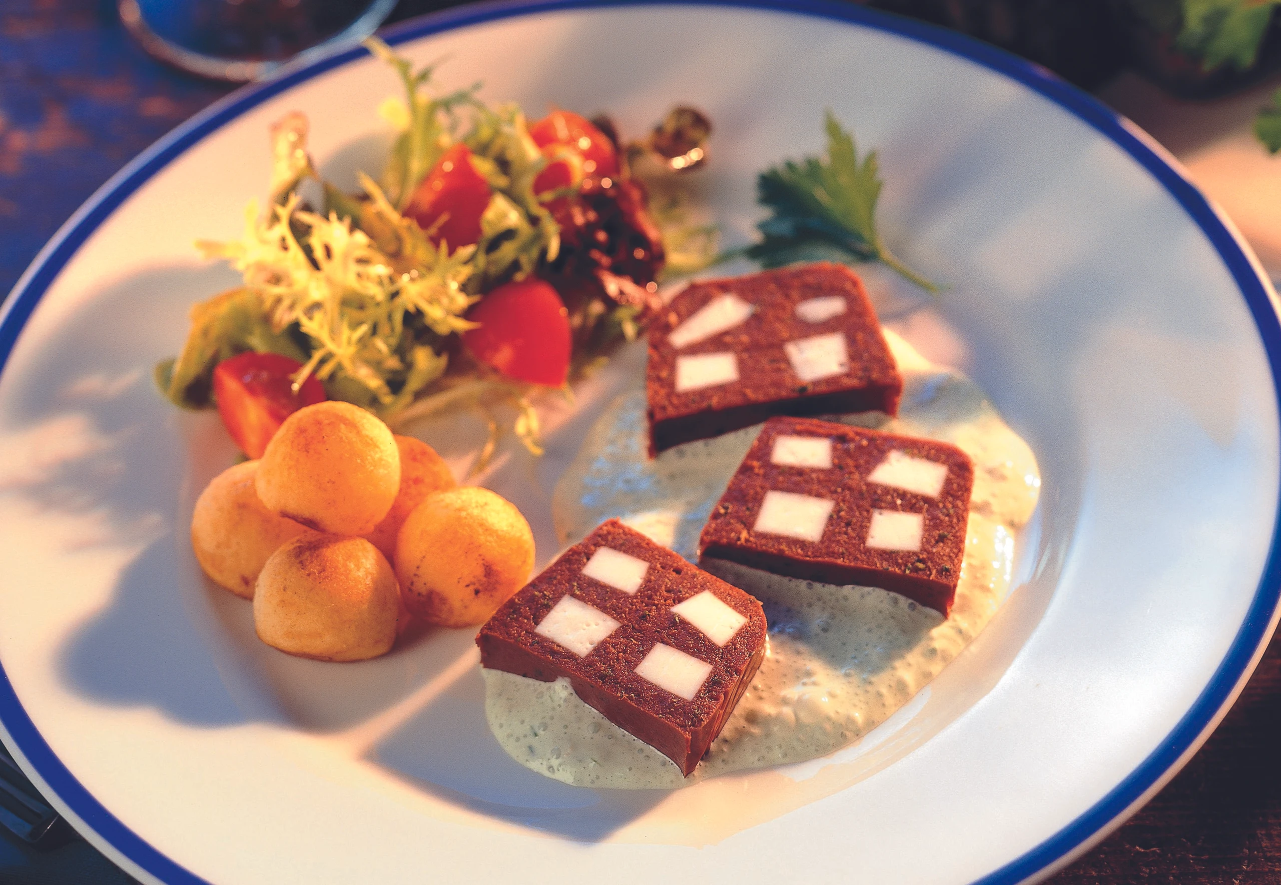 Für die Terrine Gelatine in kaltem Wasser einweichen. Blutwurst in kleine Stücke schneiden. Suppe aufkochen, Gelatine ausdrücken und darin auflösen. Wurst zugeben und unter Rühren auflösen. Mischung vom Herd nehmen, Petersil einrühren und abkühlen lassen.