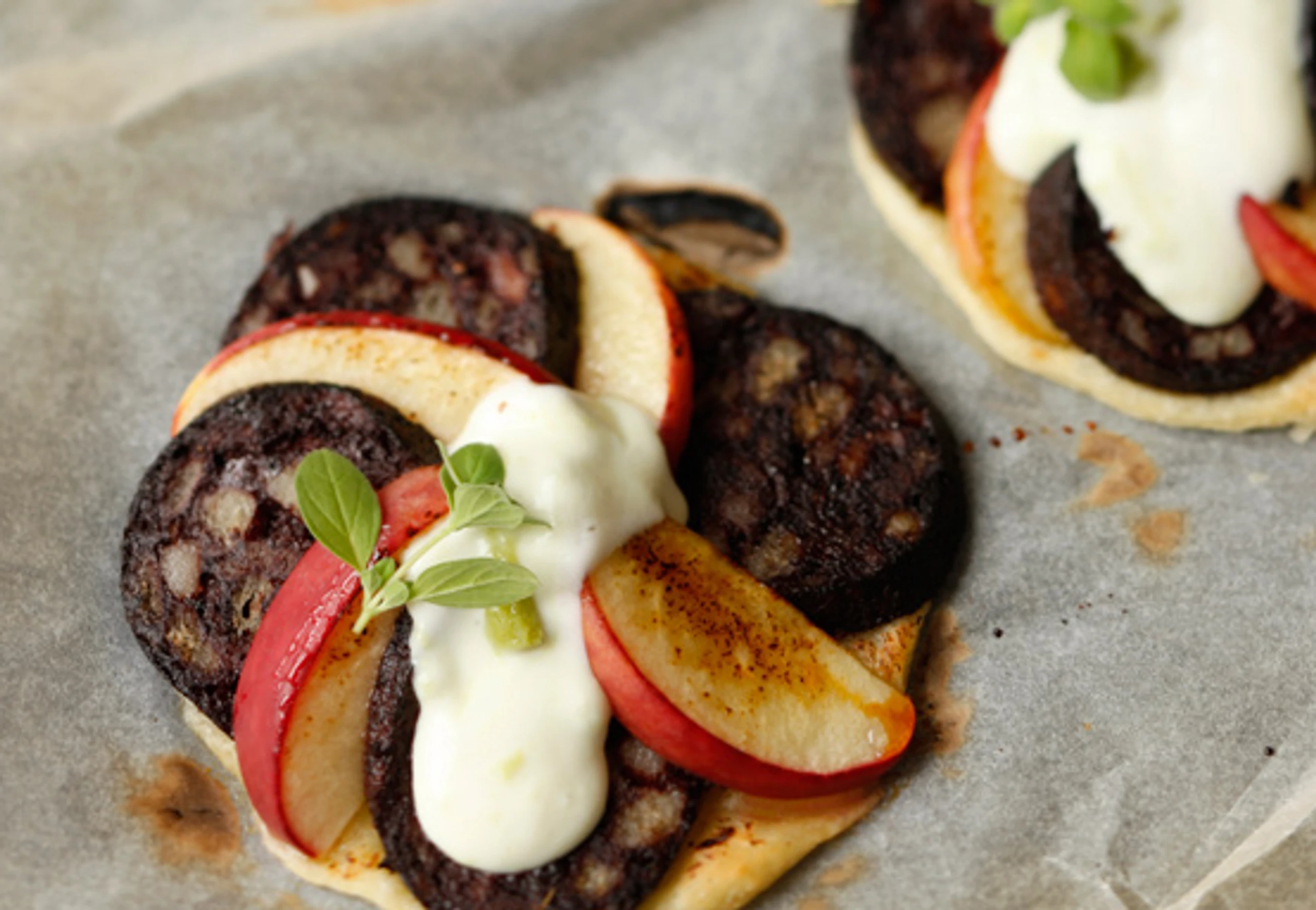 - Blutwurst enthäuten und in ca. 0,5 cm dicke Scheiben schneiden. Äpfel vierteln, Kerngehäuse entfernen, Äpfel in schmale Spalten schneiden. Teigscheiben mit Majoran bestreuen, mit Wurst- und Apfelstücken dachziegelartig belegen. Törtchen salzen, pfeffern und im Rohr (mittlere Schiene) ca. 15 Minuten backen.