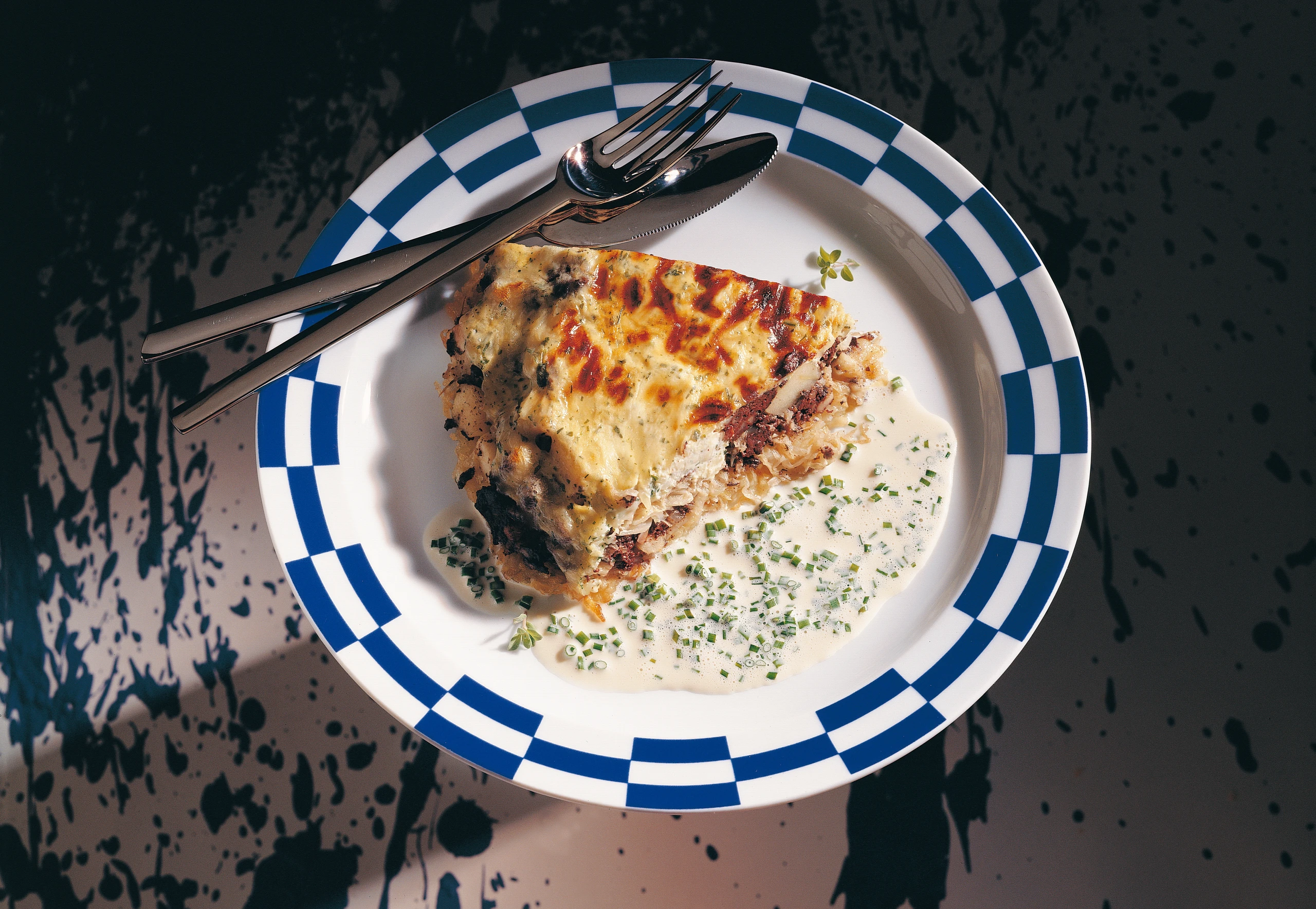 - Torte im vorgeheizten Rohr (unterste Schiene) goldgelb überbacken (dauert ca. 10 Minuten). Blutwursttorte in gleichgroße Stücke schneiden und auf Tellern anrichten.