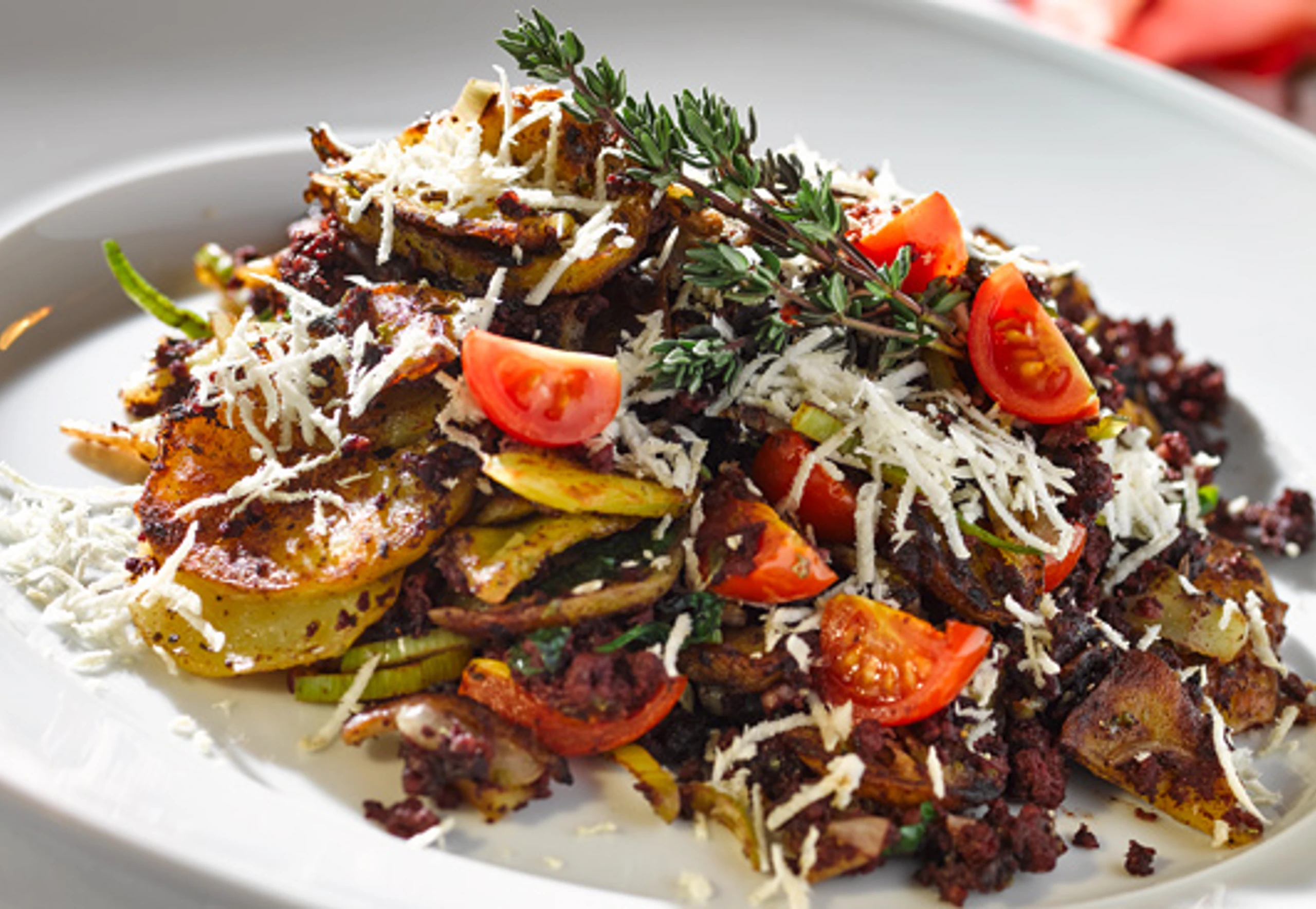 - Erdäpfel und Zwiebeln schälen. Erdäpfel in ca. 1 cm, Blutwurst in ca. 2 cm dicke Scheiben schneiden. Zwiebeln würfeln. Paradeiser vierteln.