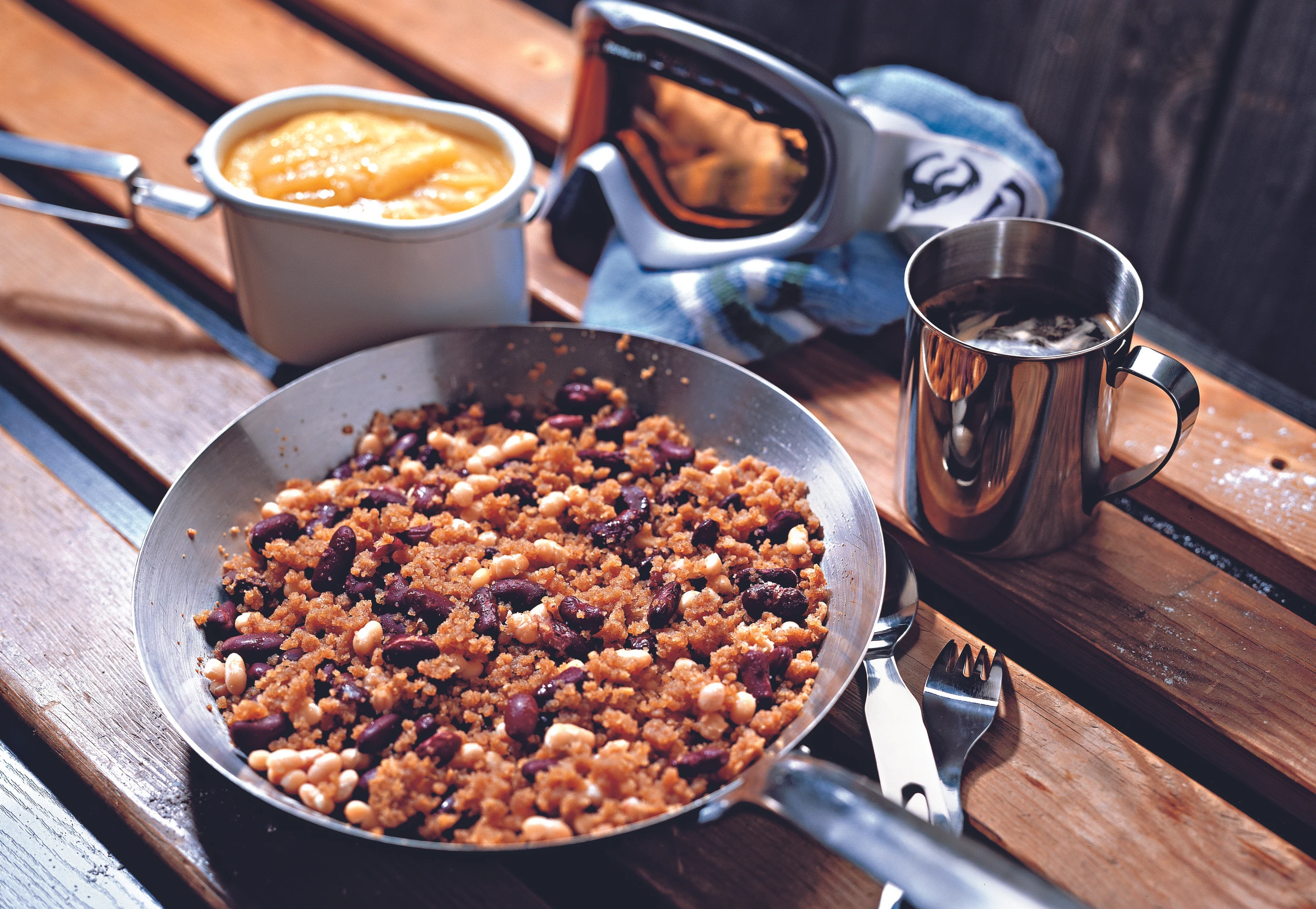 - Masse salzen, die abgetropften Bohnen unterrühren und erwärmen. Mit Apfelmus und Kaffee servieren.