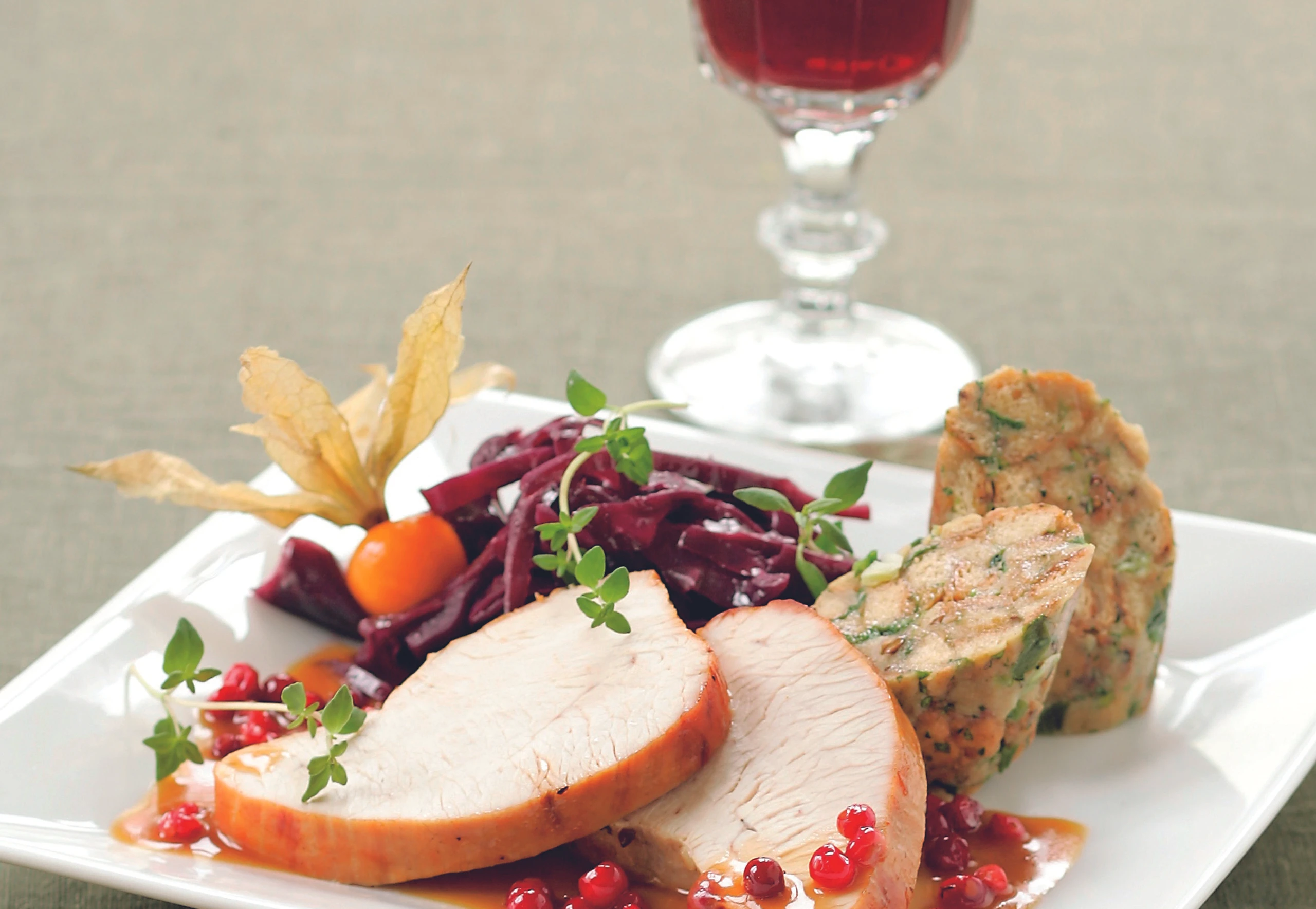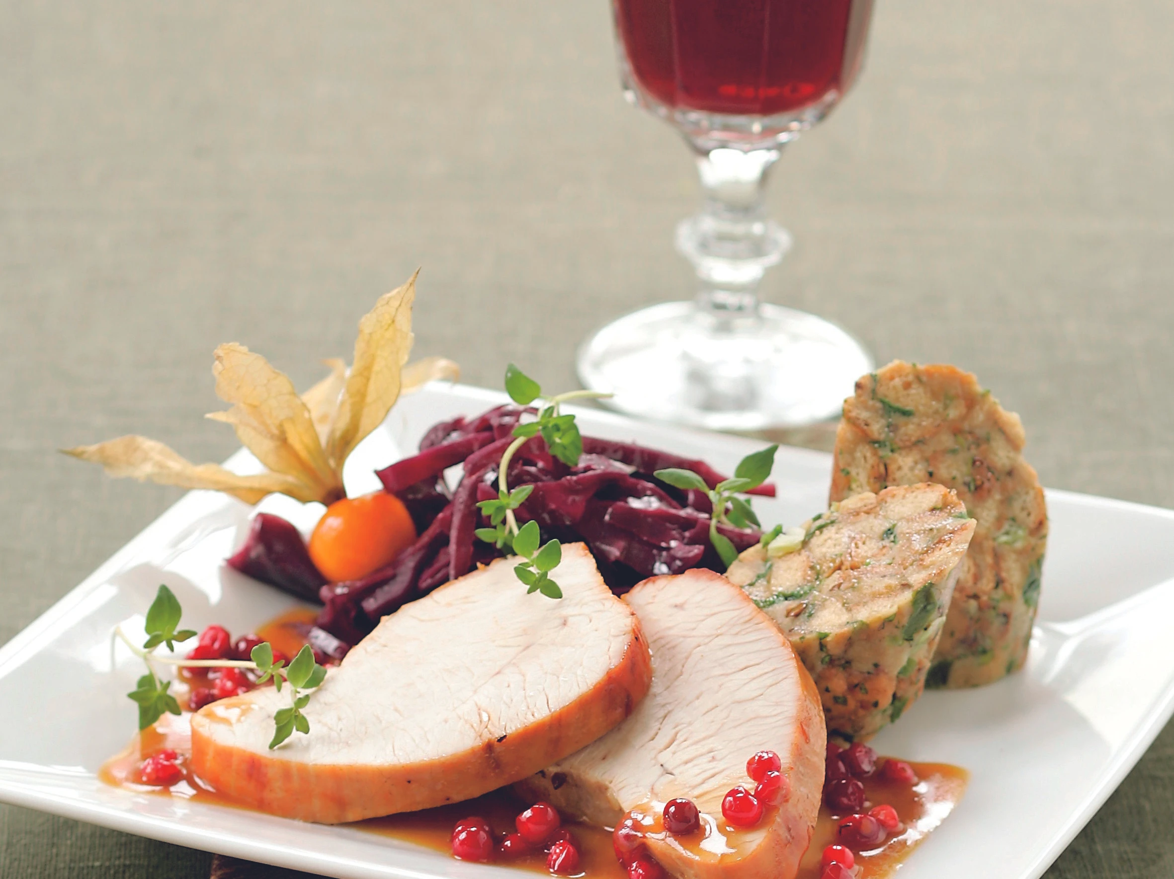 - Braten in Scheiben schneiden. Sauce durch ein Sieb gießen, Preiselbeeren einrühren und aufkochen. Fleisch mit der Sauce anrichten.