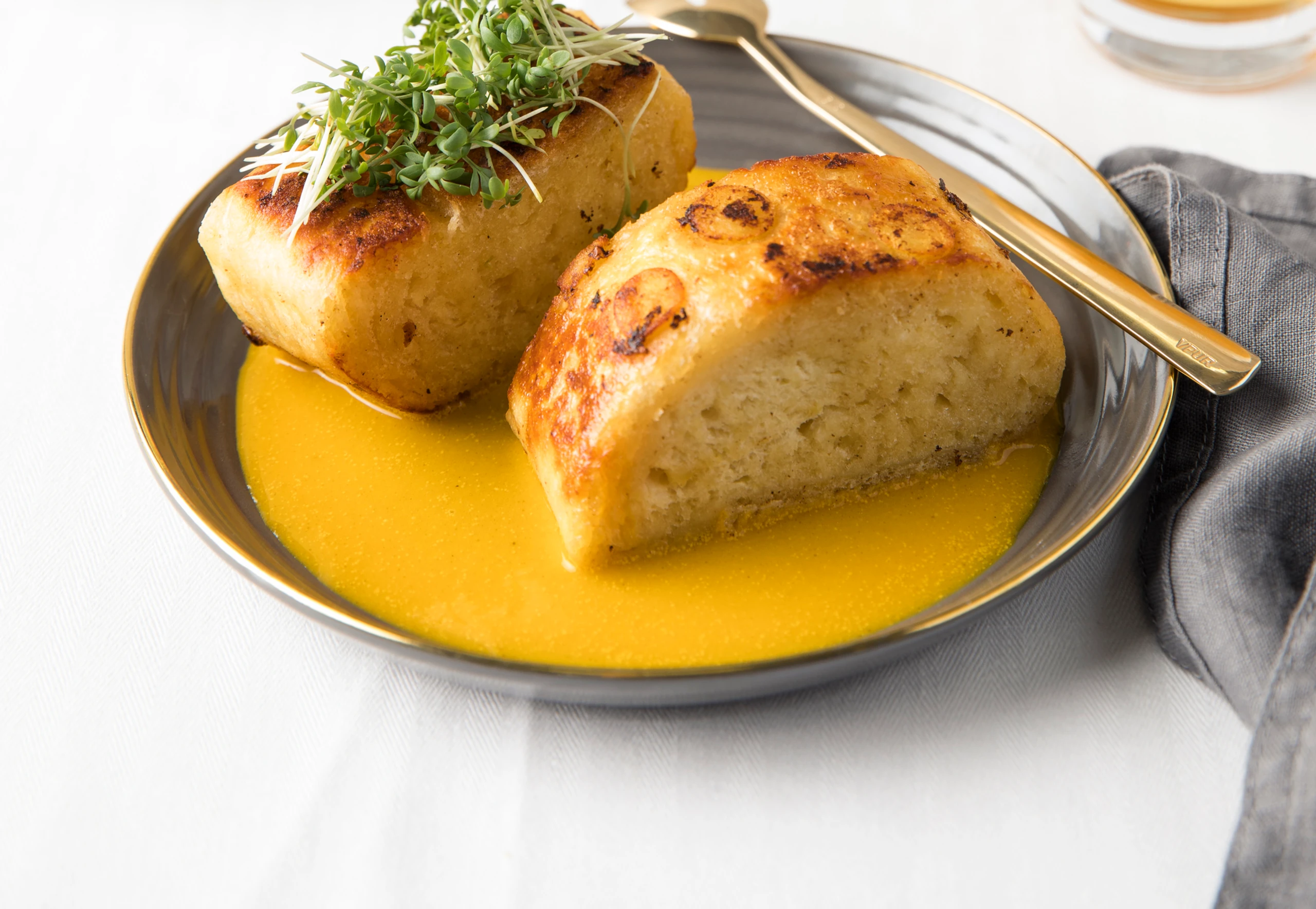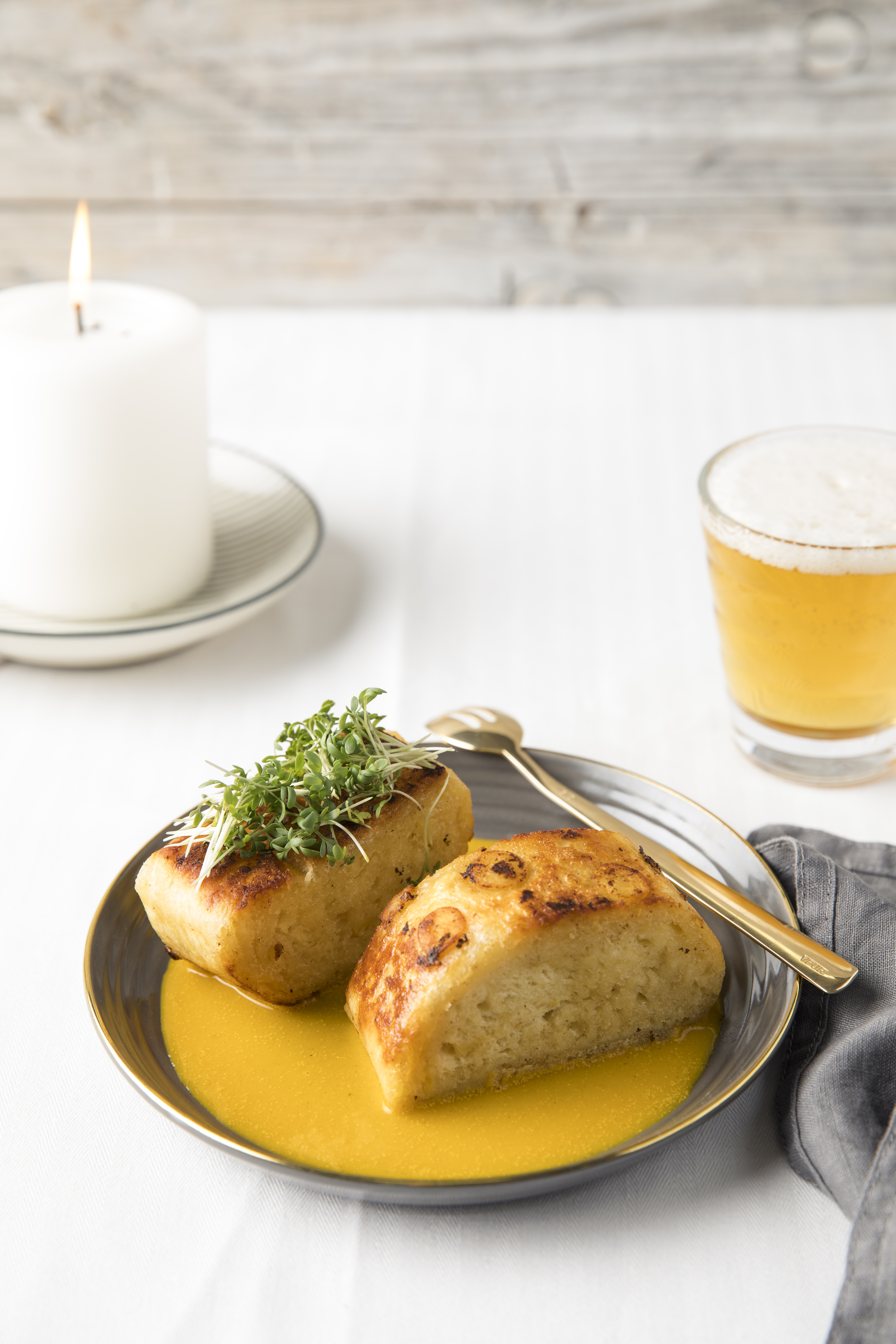 Kresseblättchen von den Stielen schneiden. In einer Pfanne Butter aufschäumen, Knödelscheiben einlegen und rundum kurz braten. Knödel mit der Sauce anrichten und mit Kresse bestreut servieren.
