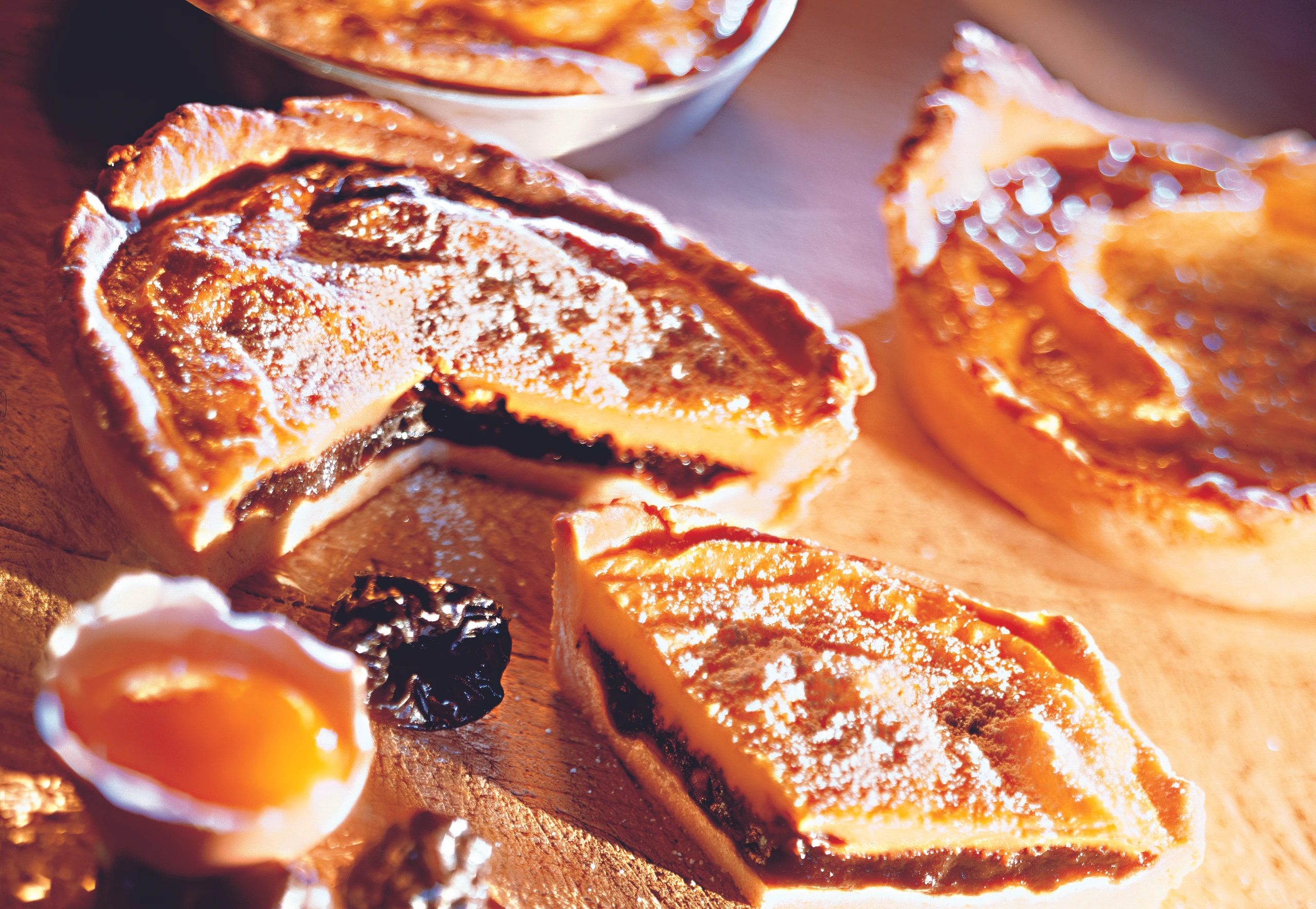 Tartes im vorgeheizten Rohr (mittlere Schiene / Gitterrost) ca. 1/2 Stunde backen. Wenn die Oberfläche zu stark bräunt, die Tartes gegen Ende der Garzeit mit Alufolie abdecken. Dazu kann man in Rotwein gekochte Dörrzwetschken servieren.