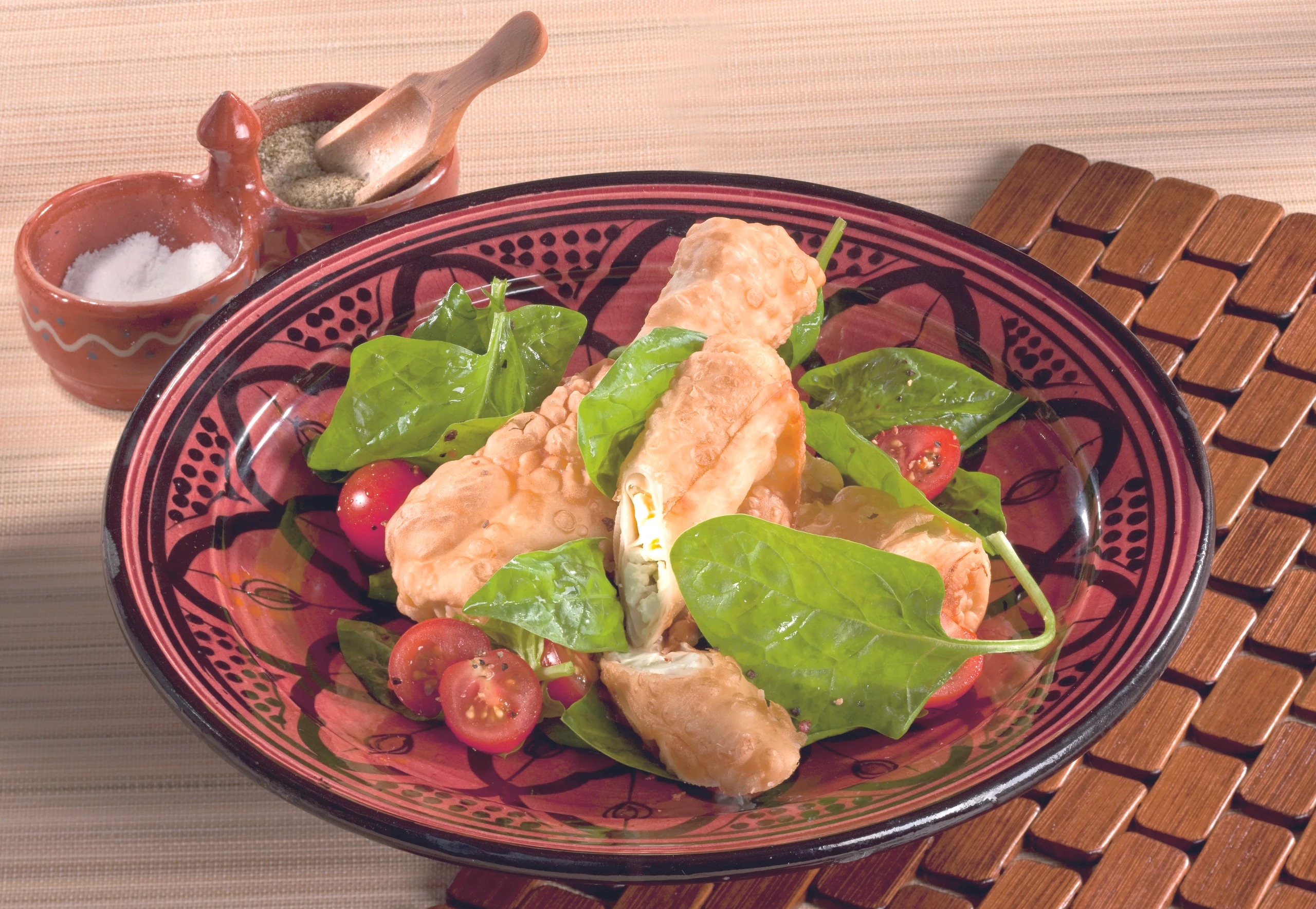 Spinat und Paradeiser mit der Marinade vermischen. Röllchen mit dem Salat anrichten.