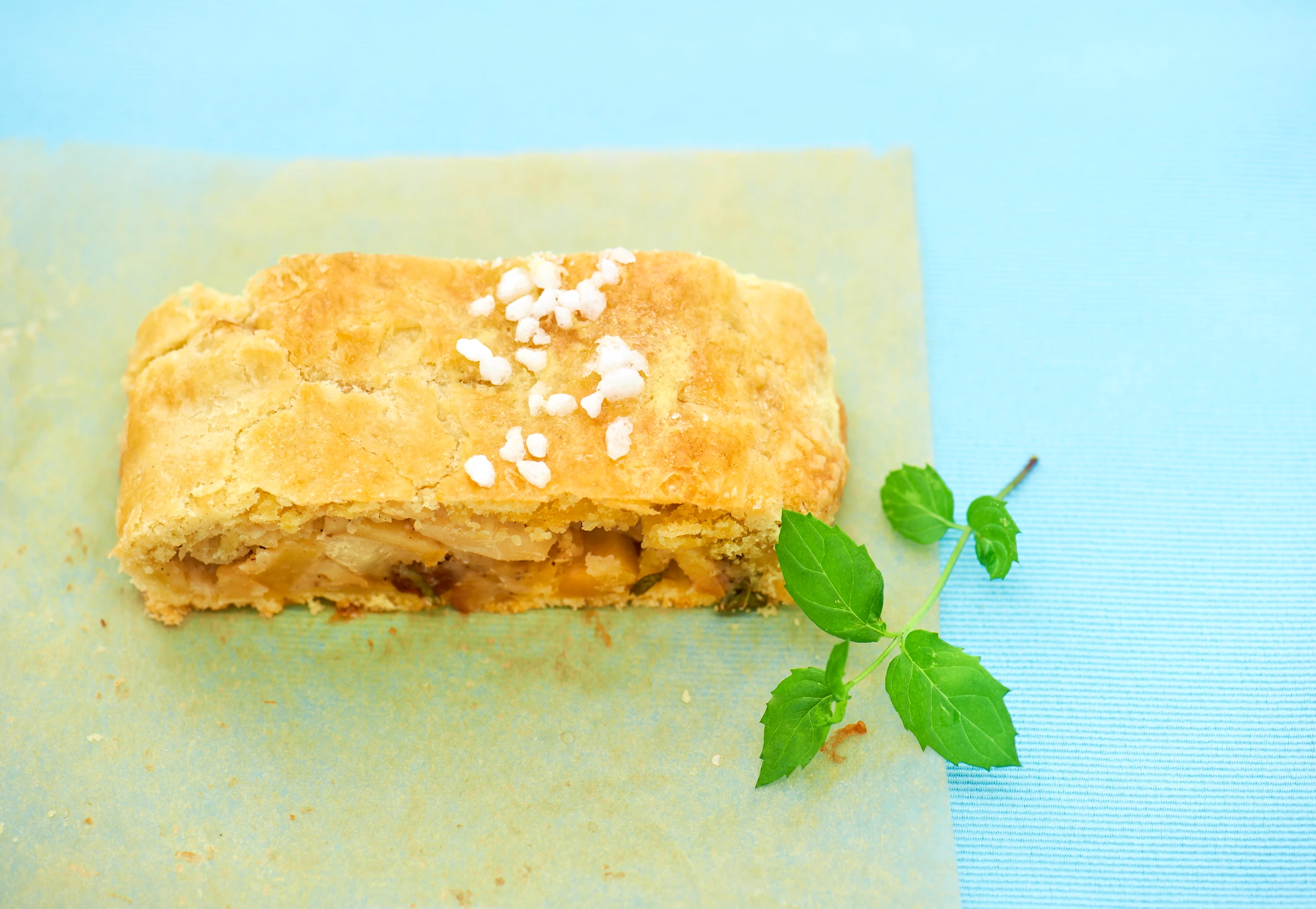 Teig quadratisch (40 x 40 cm) ausrollen. Fülle der Länge nach in die Mitte des Teiges streichen, Teig von beiden Seiten darüber schlagen. Auf das Backblech legen, mit Ei bestreichen, mit Hagelzucker bestreuen und im Rohr (mittlere Schiene) ca. 50 Minuten backen.