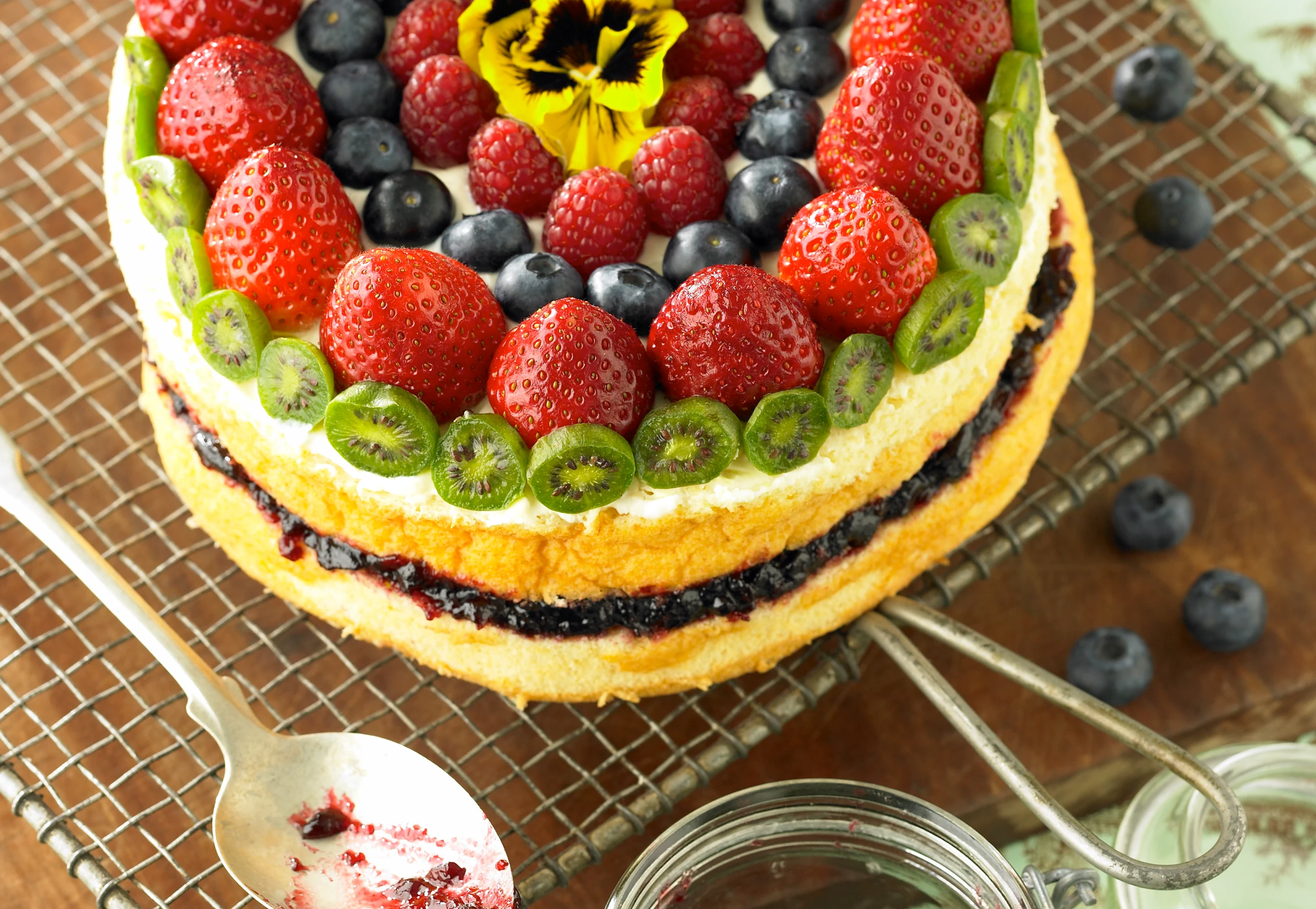 - Torte durchschneiden, mit Marmelade füllen, mit geschlagenem Obers bestreichen. Früchte putzen, evtl. in Stücke schneiden, mit Orangenlikör vermischen. Torte mit den Früchten garnieren.