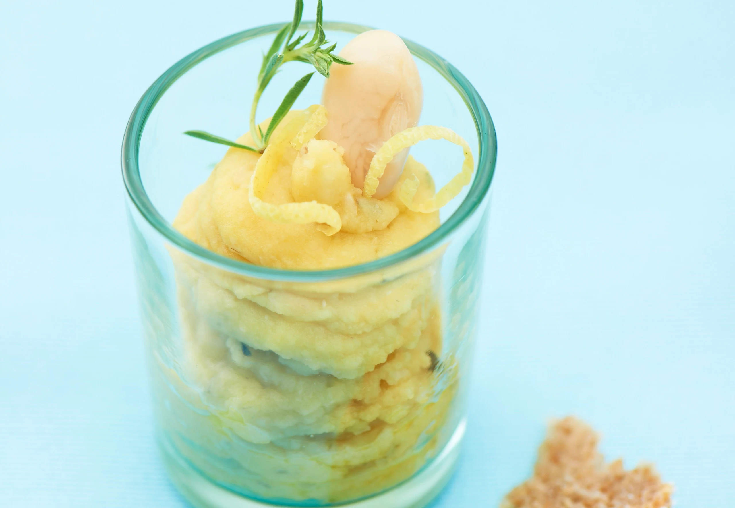 Mischung umfüllen, mit einem Stabmixer unter Zugabe des restlichen Öls pürieren. Püree mit Salz, Pfeffer und Zitronensaft abschmecken. Creme in einen Dressiersack füllen und in Gläser dressieren. Mit Bohnenkraut und Zitronenzesten garnieren.