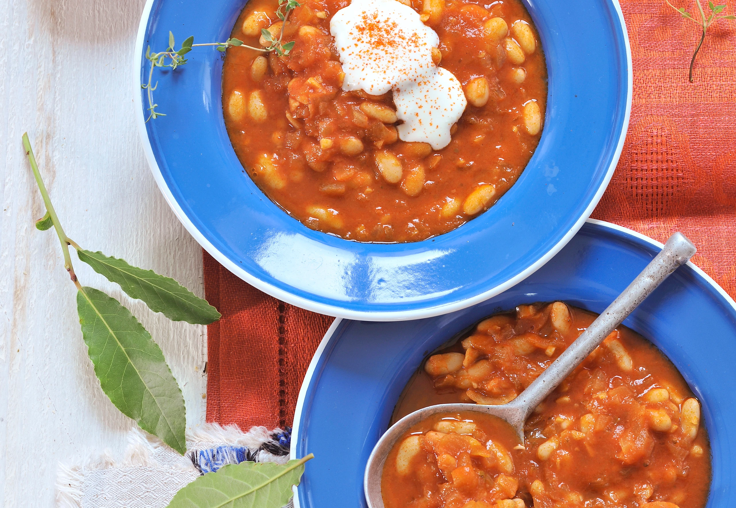 Bohnengulasch eventuell nachsalzen, Lorbeerblatt entfernen. Joghurt und Sauerrahm glatt rühren. Bohnengulasch anrichten, mit der Rahmmischung garnieren, mit Paprikapulver bestreuen.