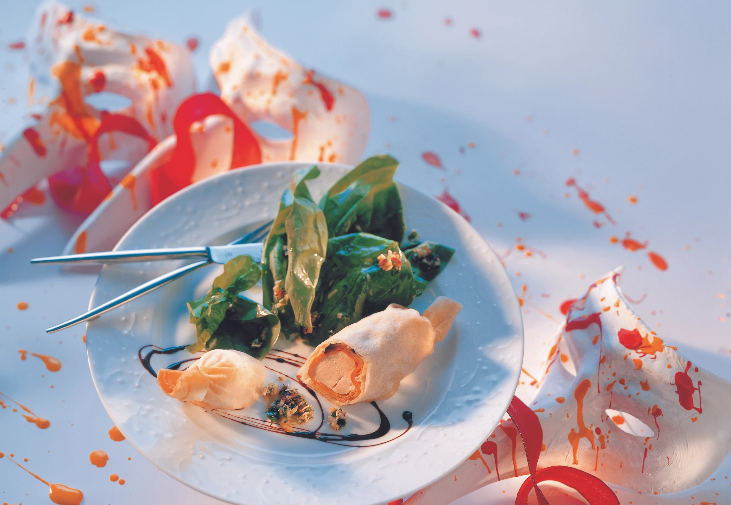 Ca. 3 Finger hoch Öl erhitzen. Gemüseröllchen darin hell backen, mit einem Siebschöpfer herausheben und auf mehreren Lagen Küchenpapier gut abtropfen lassen. Parallel dazu die Glace kurz erhitzen. „Bonbons“ mit der Glace und dem kurzgebratenen Spinat anrichten.