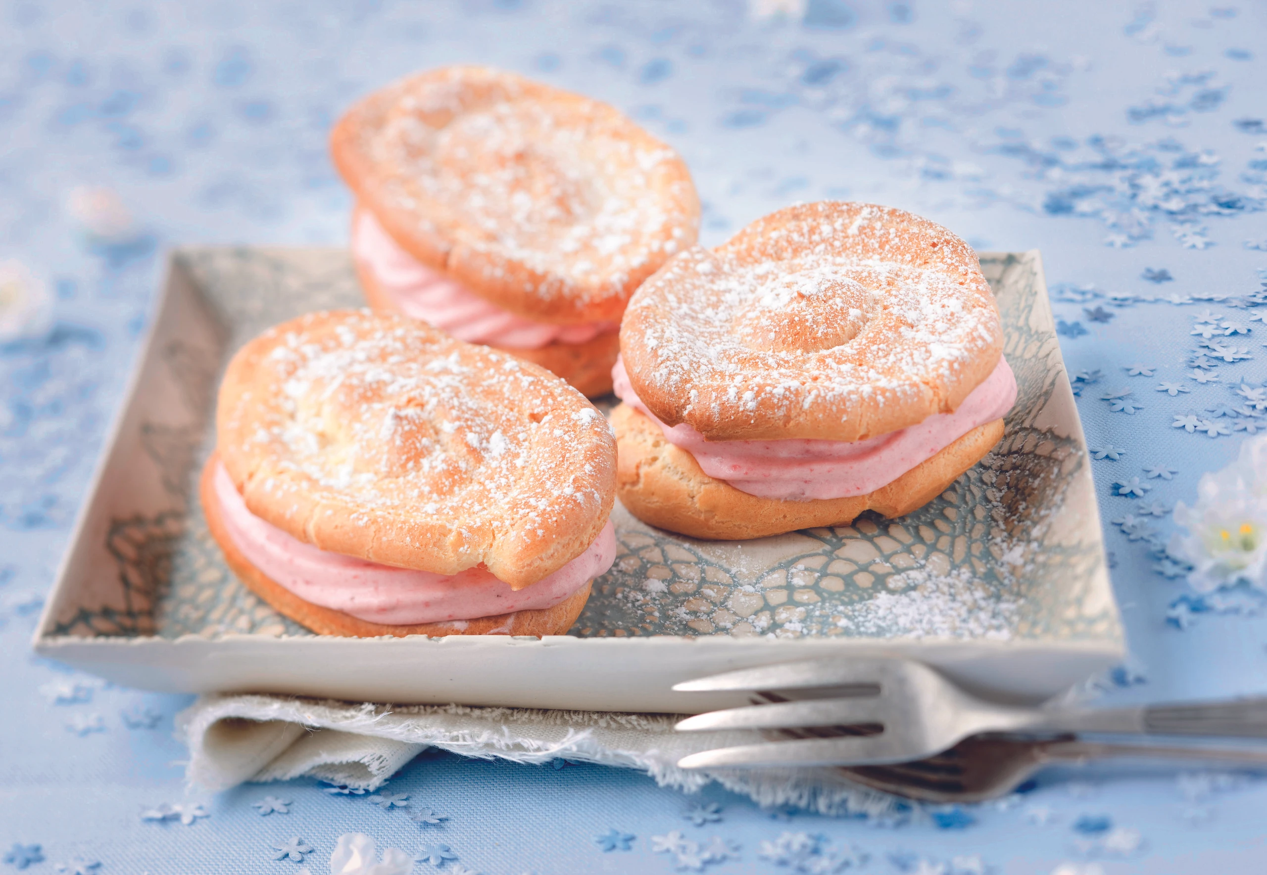 Erdbeercreme in einen Dressiersack mit Sterntülle füllen und auf 6 der Brandteigscheiben dressieren. Übrige Scheiben darauf setzen und leicht andrücken. Brandteig-Eier mit Staubzucker bestreuen.
