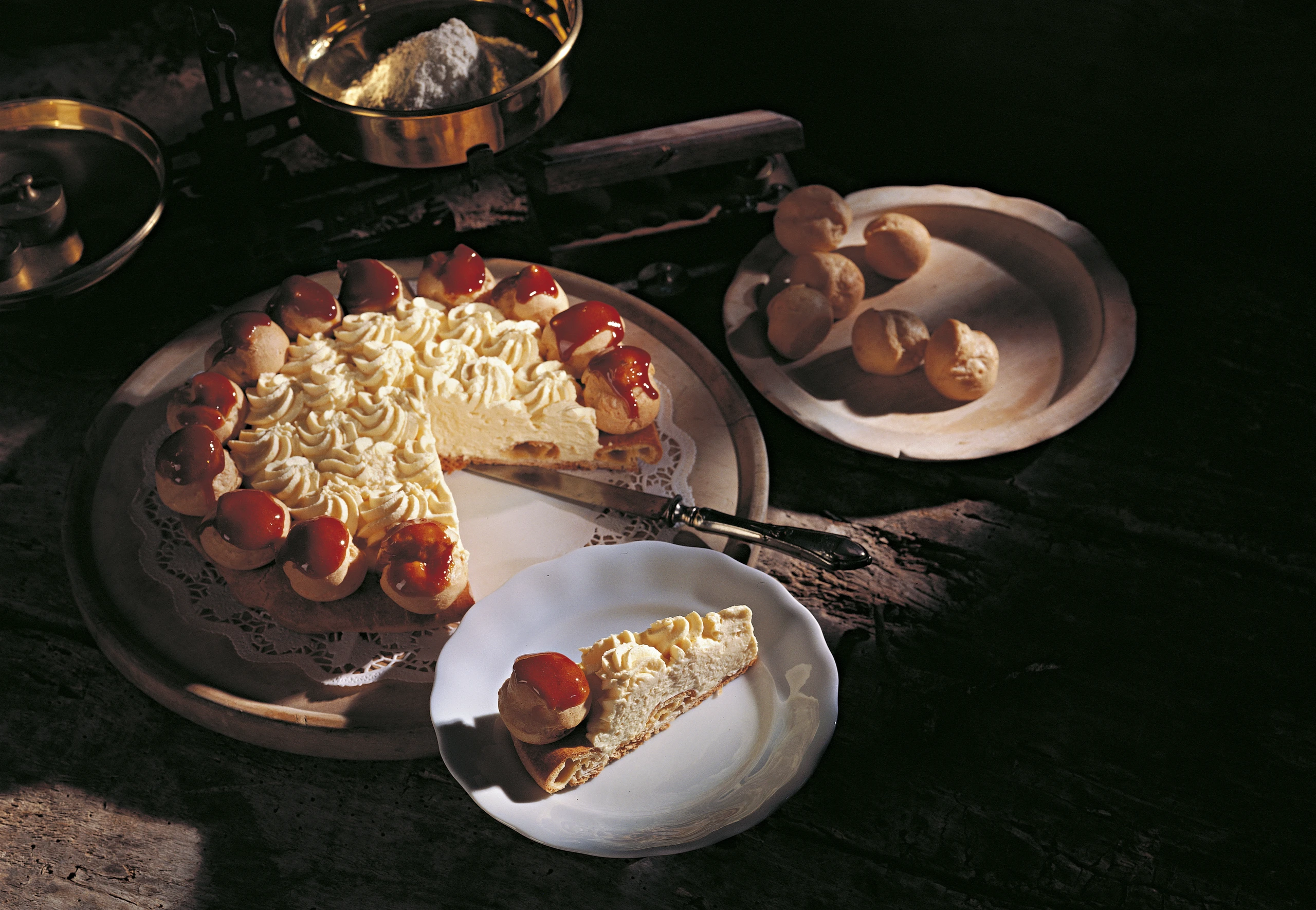 Die zweite Hälfte der Creme in einen Dressiersack mit Sterntülle füllen. Tülle vom Boden her in die Brandteigkugeln stechen und Creme hineinspritzen. Kugeln am Tortenrand aufsetzen.