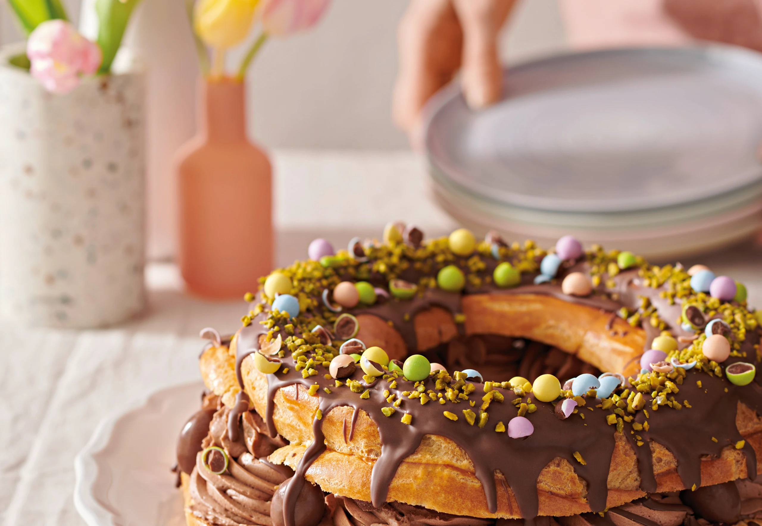 Brandteigkranz horizontal halbieren. Boden mit Marmelade bestreichen. Creme aufdressieren. Mit Schokoeiern garnieren. Deckel darauflegen.