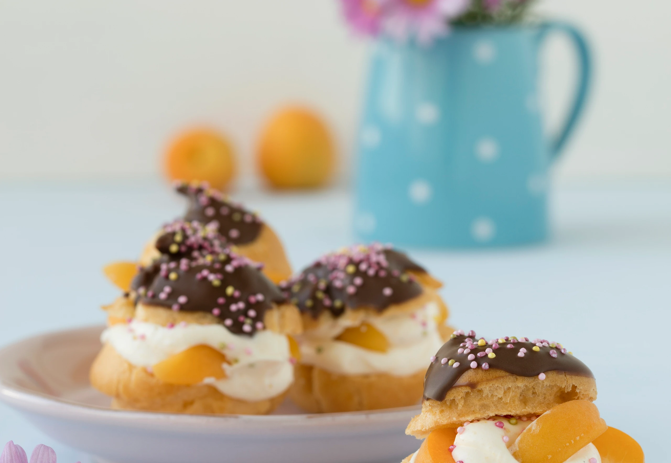 Krapferl horizontal durchschneiden, Deckel mit der Oberseite in die Kuvertüre tauchen, wenden und mit Zuckerstreusel bestreuen. Kuvertüre fest werden lassen. Creme auf die Böden dressieren und mit Marillenspalten garnieren. Deckel aufsetzen und behutsam andrücken.