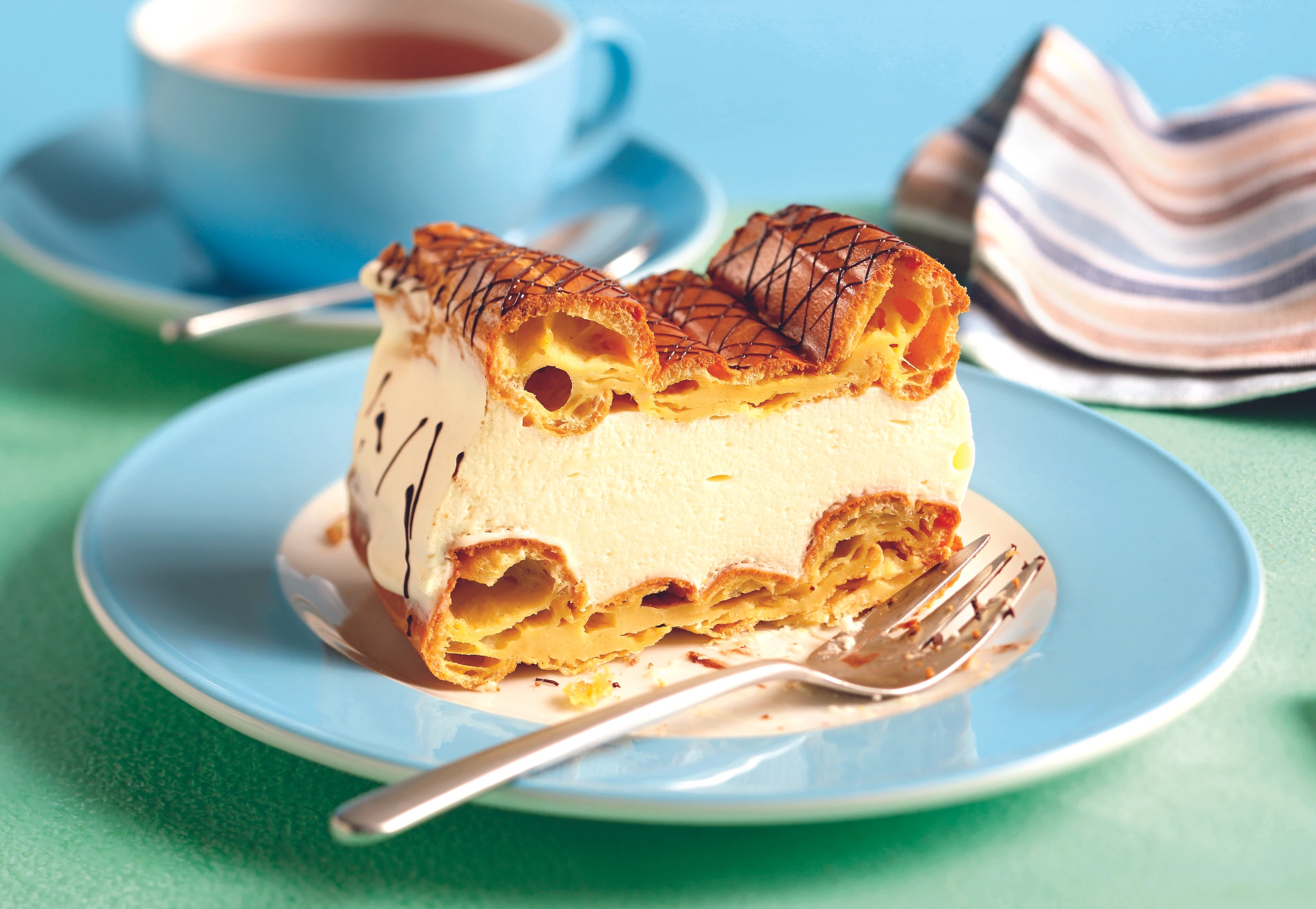Einen Teigboden auf ein Brett legen, mit einer Rahmenform abgrenzen, Creme darin verteilen. Mit dem zweiten Teigboden belegen. Schnitte für ca. 4 Stunden kühl stellen.