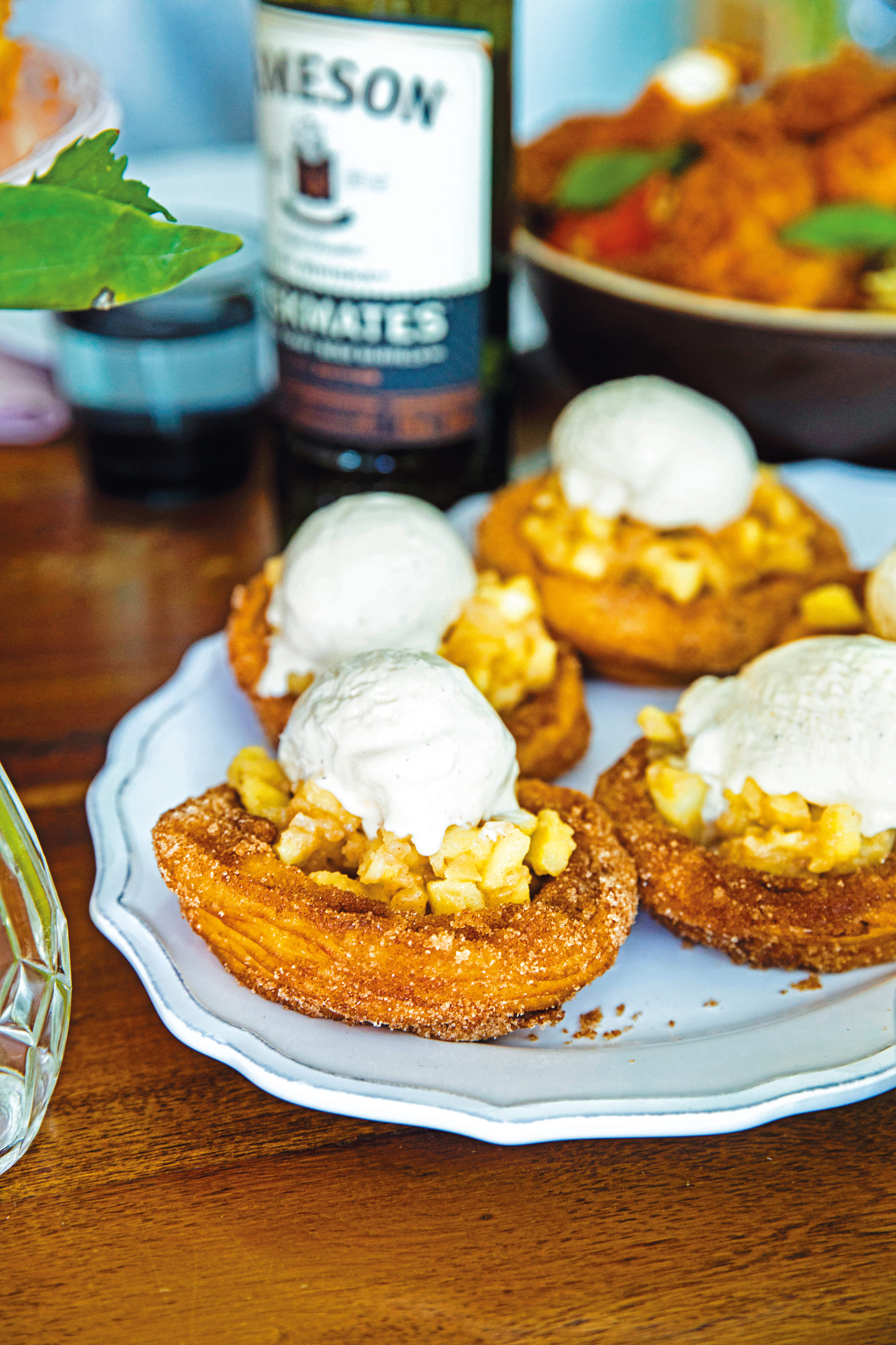 Zucker und Zimt vermischen. Öl in einem schmalen, hohen Topf erhitzen. Schüsserl darin nacheinander goldbraun frittieren und im Zimtzucker wälzen. Mit den Äpfeln füllen und mit Vanilleeis servieren.