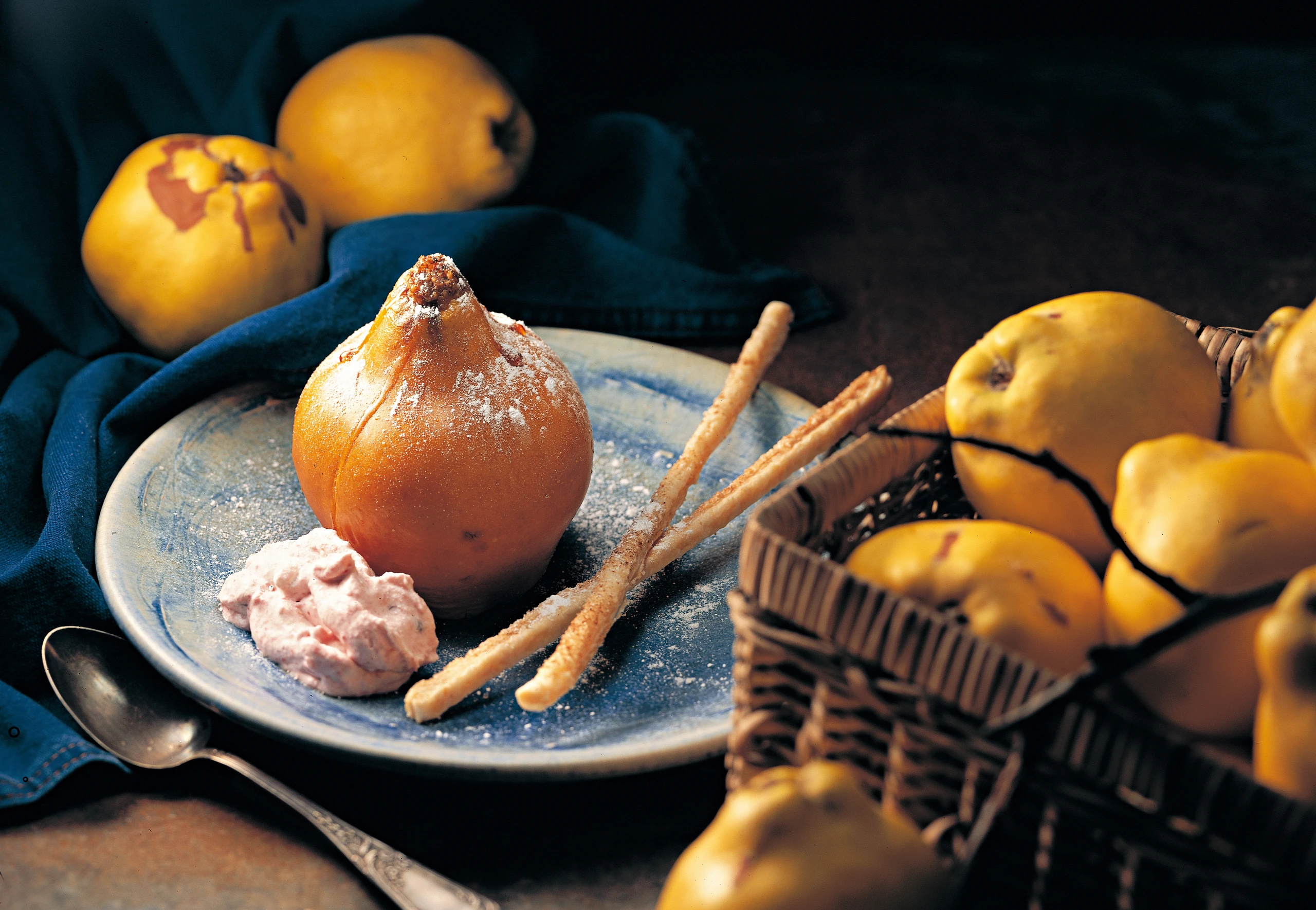 Die Quitten aus dem Backrohr nehmen, 3–4 Minuten überkühlen lassen, mit Staubzucker bestreuen und mit Zimtstangerln und Preiselbeer-Obers servieren.