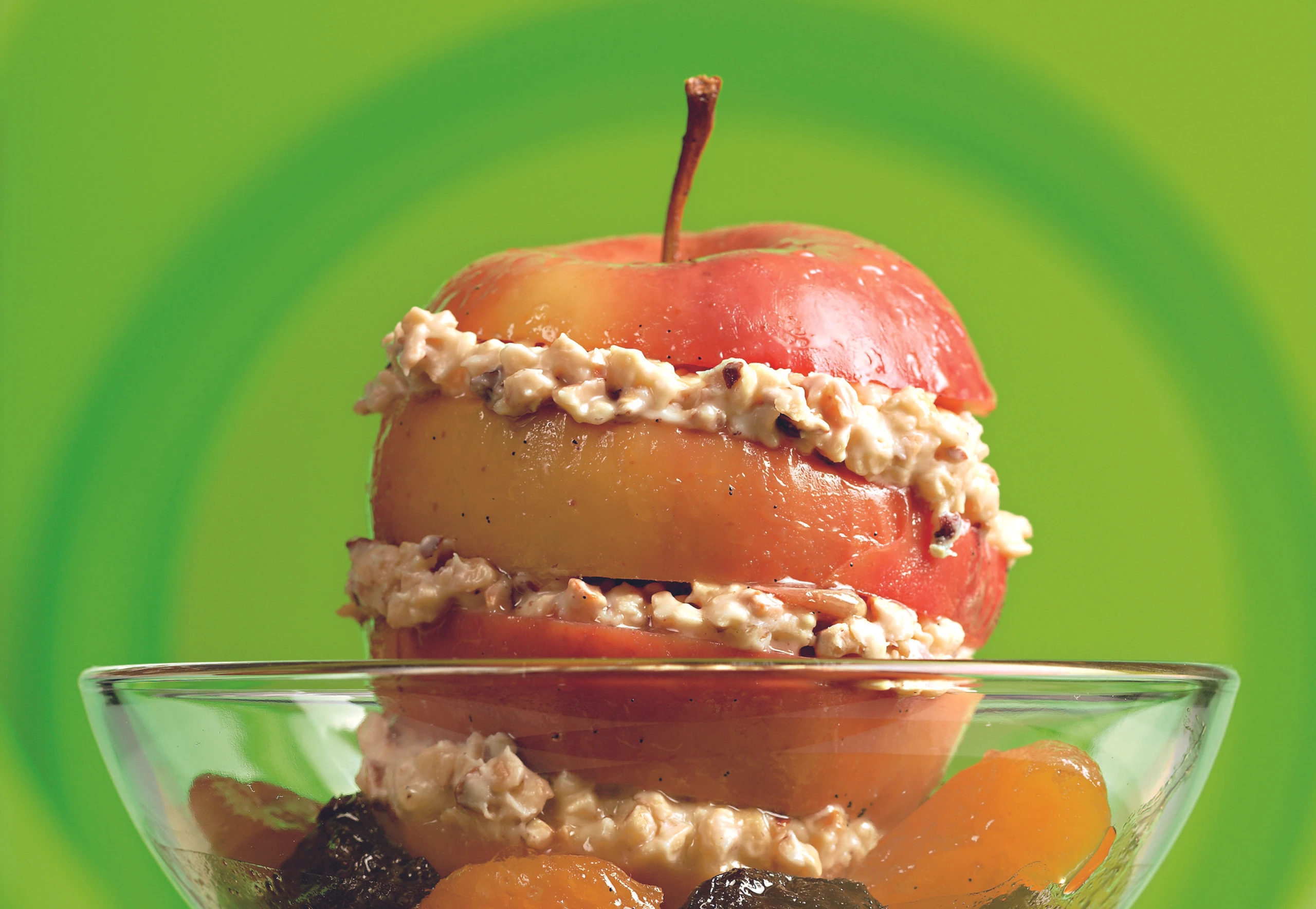 Für die Garnitur Marillen und Pflaumen halbieren. Apfelsud aufkochen und die Früchte darin weich dünsten. Äpfel mit den Früchten anrichten.
