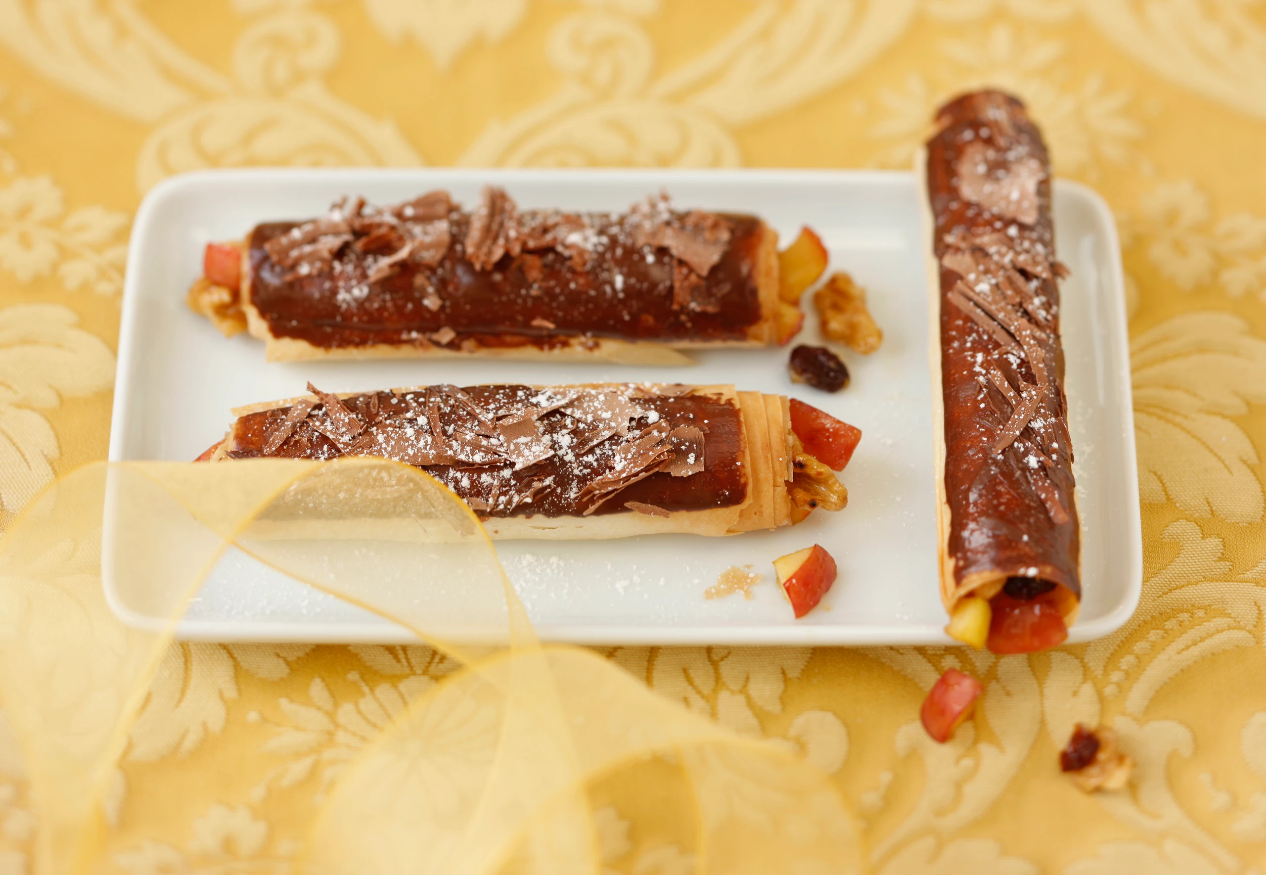 Unmittelbar vor dem Servieren Röllchen mit Apfelmasse füllen, am besten mit einem Dressiersack mit glatter Tülle (Ø 1,5 cm).