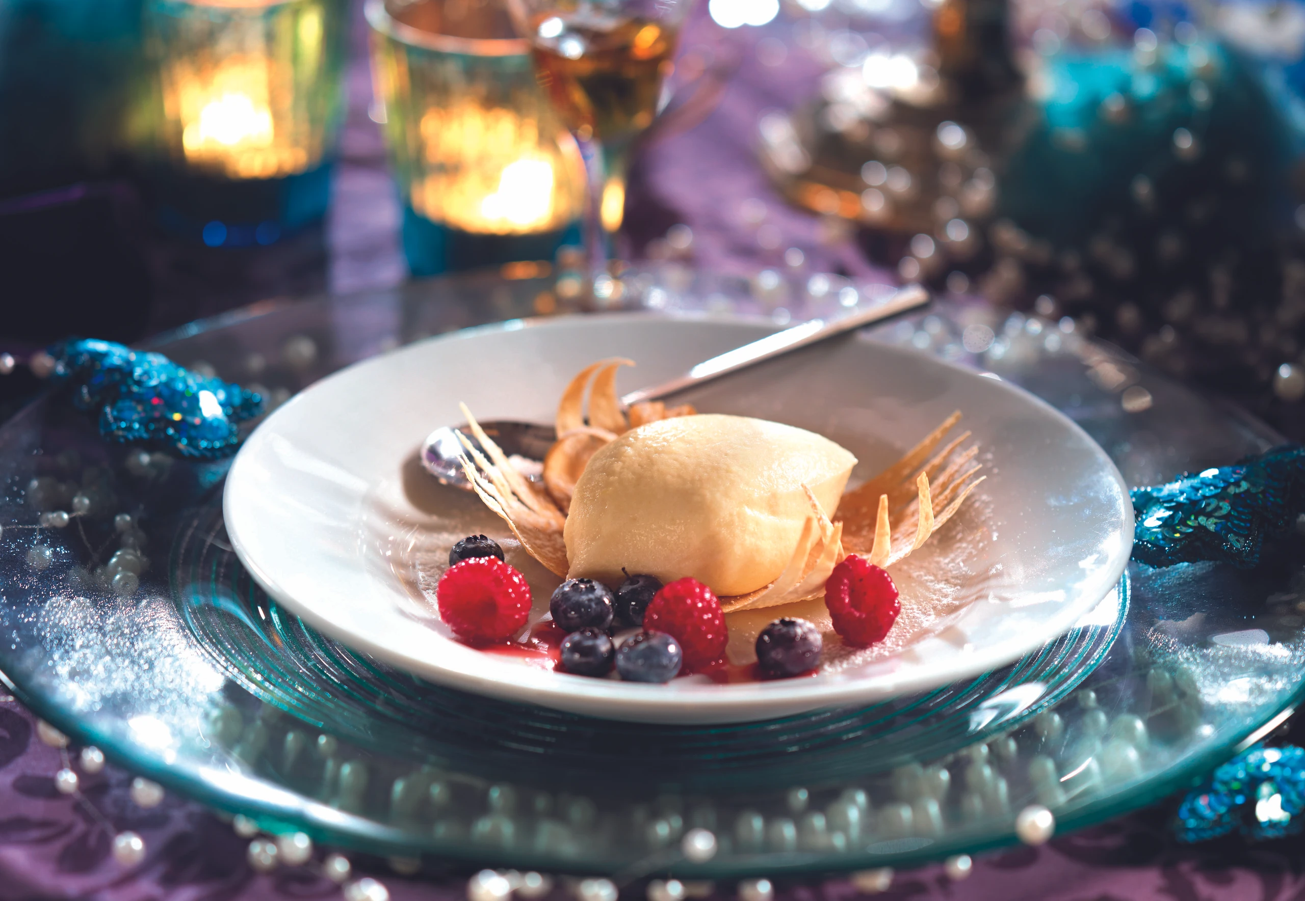 Beeren mit Zucker erwärmen. Aus der Creme Nocken ausstechen, auf die Strudelblätter setzen, mit Beeren garnieren.