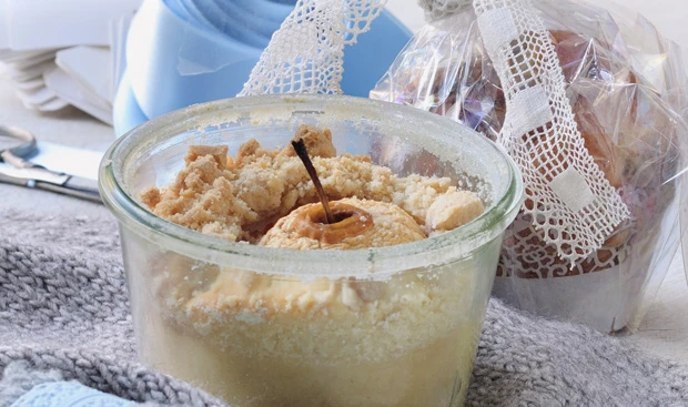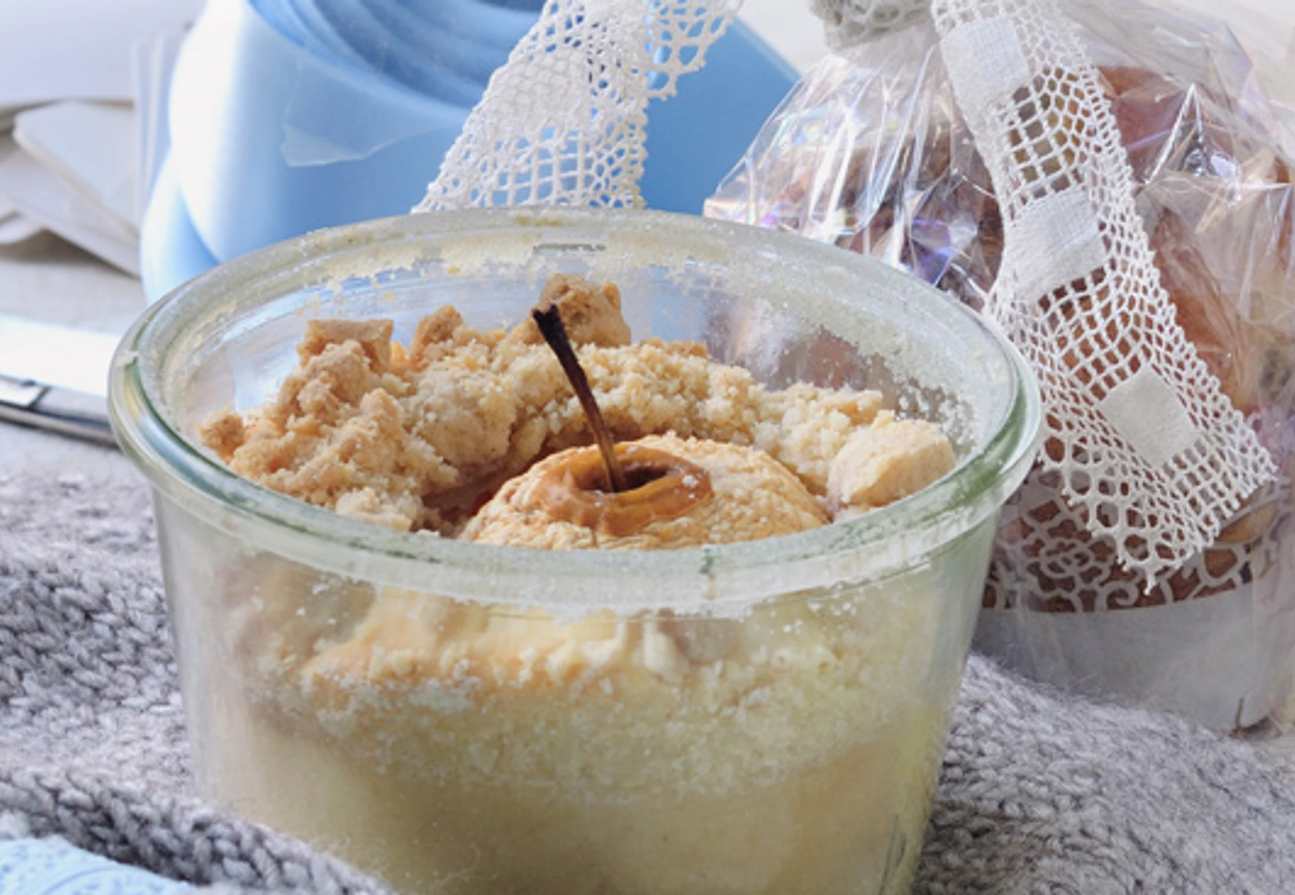 Teig in die Gläser füllen, Äpfel hineinstecken und im Rohr (mittlere Schiene / Gitterrost) ca. 40 Minuten backen. Nach halber Garzeit Äpfel mit Streusel bestreuen.