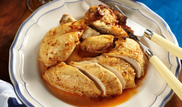 - Rohr auf 200°C vorheizen. Huhn in 3 EL Öl rundum anbraten (Brustseite zuerst), ins Rohr schieben und ca. 90 Minuten braten; dabei öfter mit wenig vom Wasser untergießen und mit dem entstehenden Saft übergießen.