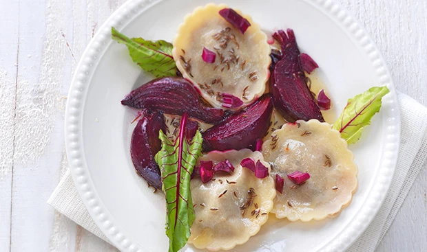 Rote Rüben schälen und in Spalten schneiden. Butter aufschäumen, Kümmel zugeben. Rote Rüben darin kurz anbraten, mit Balsamico abschmecken. Ravioli mit Roten Rüben anrichten, mit den zarten Blättern garnieren, mit der Kümmelbutter übergießen.