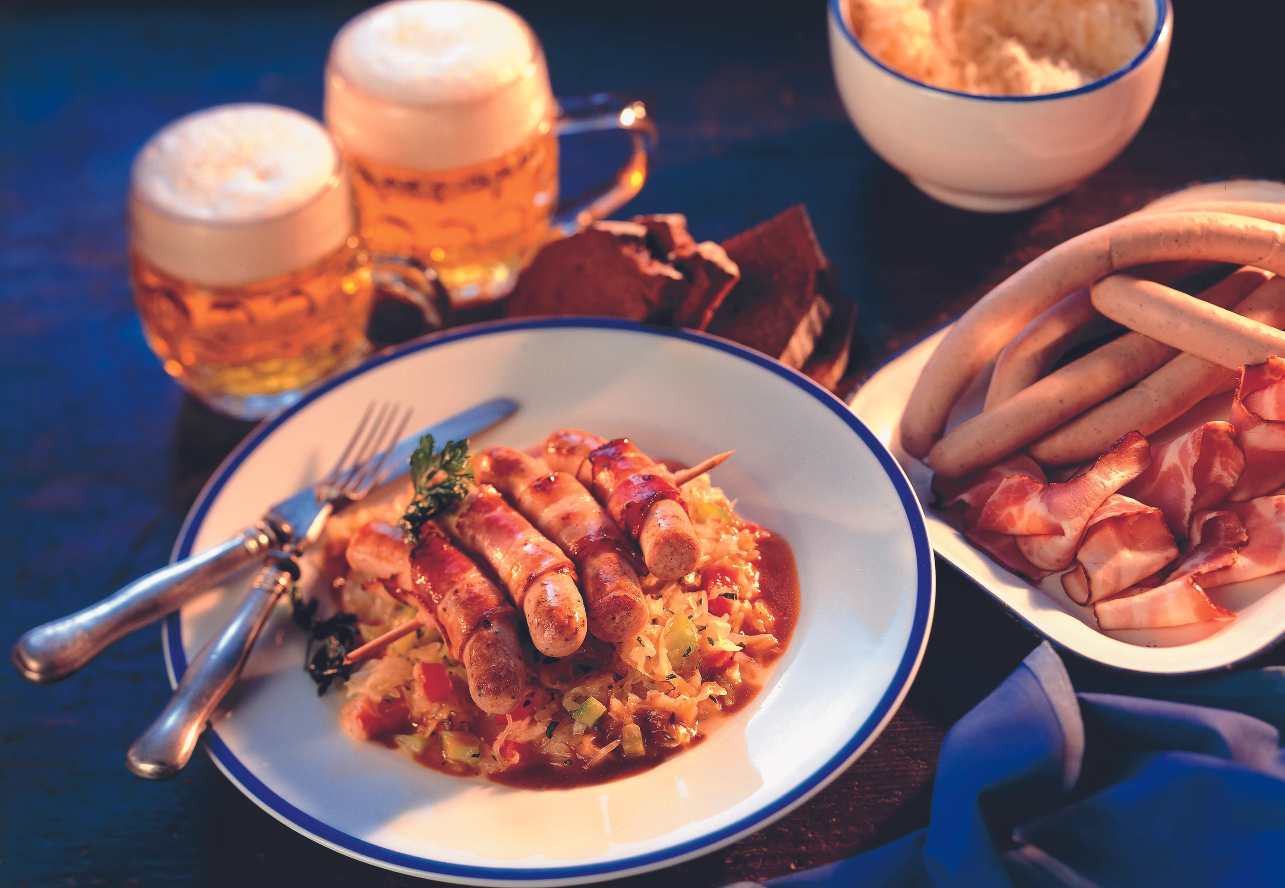 - Backrohr auf Grillstellung vorheizen. Bratwürstel halbieren und mit Speckscheiben umwickeln. Je 4 Bratwürstel auf einen Spieß stecken, mit Salz und Pfeffer würzen und in ca. 3 EL Öl beidseitig braten. Parallel dazu die Brote dünn mit Öl bestreichen und im Rohr (Gitterrost) knusprig toasten. Die Würstelspieße mit den Broten und Kraut anrichten.