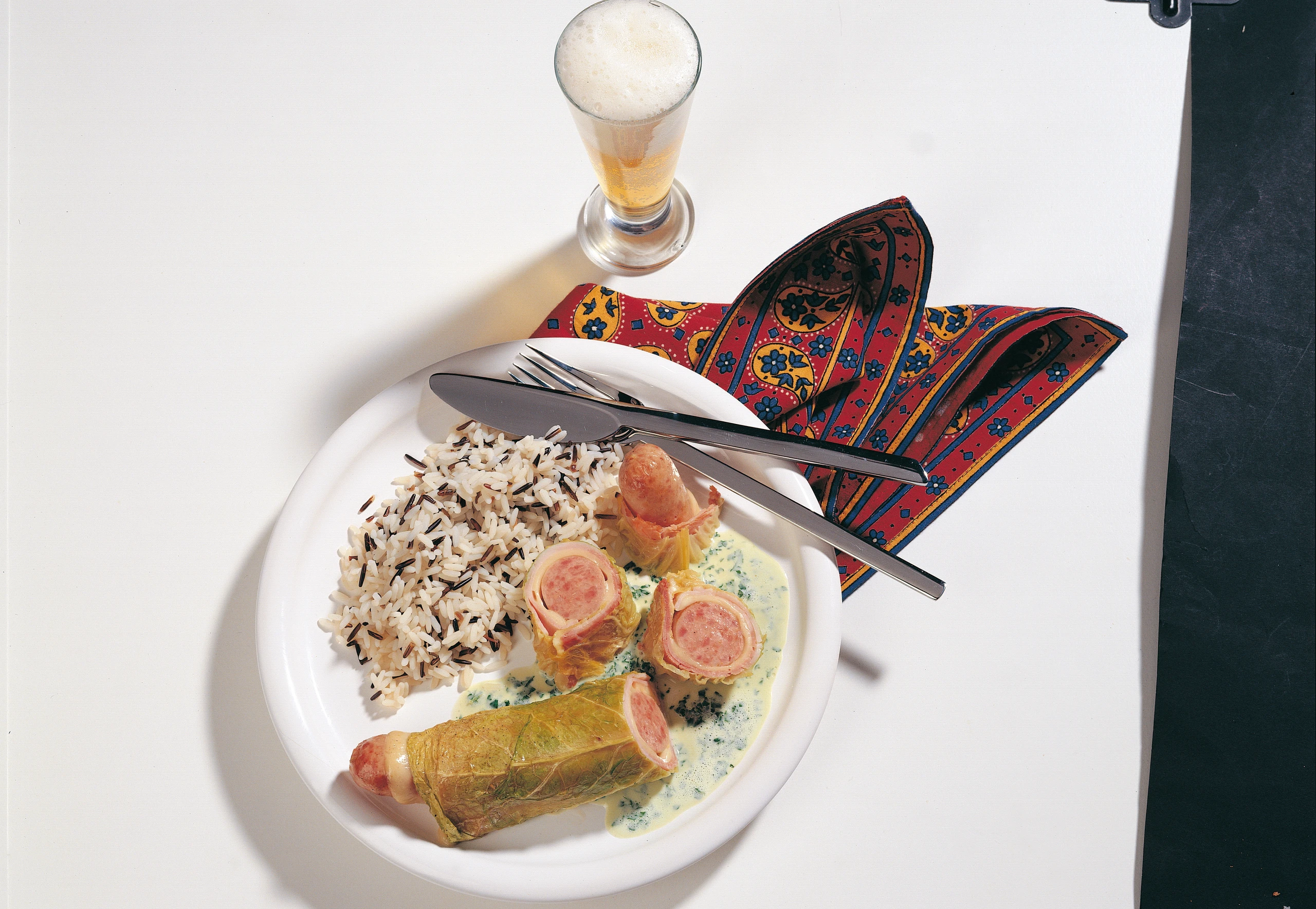 Kohlblätter mit Salz und Pfeffer würzen und zuerst mit Schinken, dann mit Gouda belegen. Je ein Würstel an den unteren Rand jedes Blattes legen. Kohlblätter straff über die Würstel einrollen.