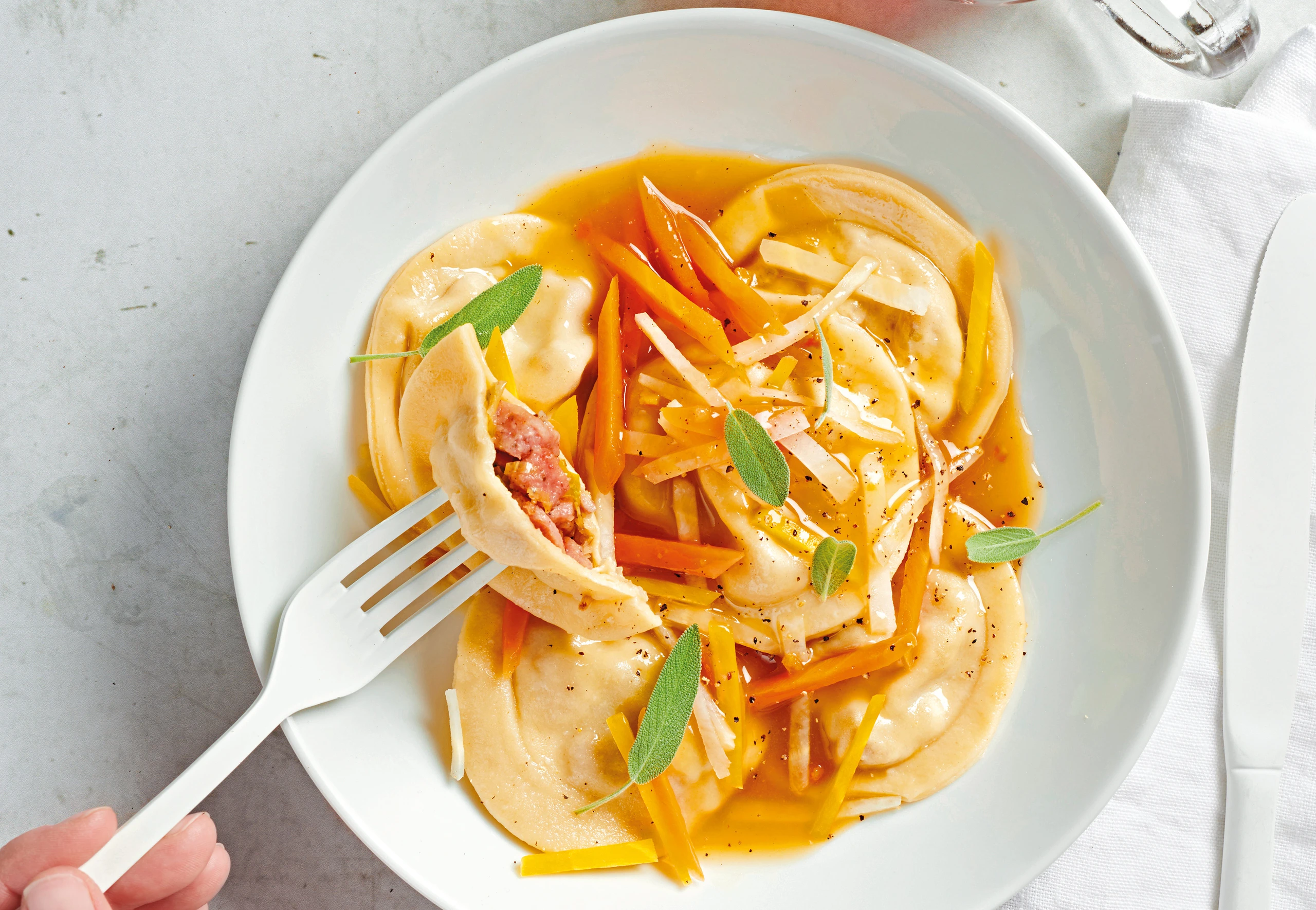 Bratwurst-Ravioli mit Gemüse und Schwarzbier-Honigsauce