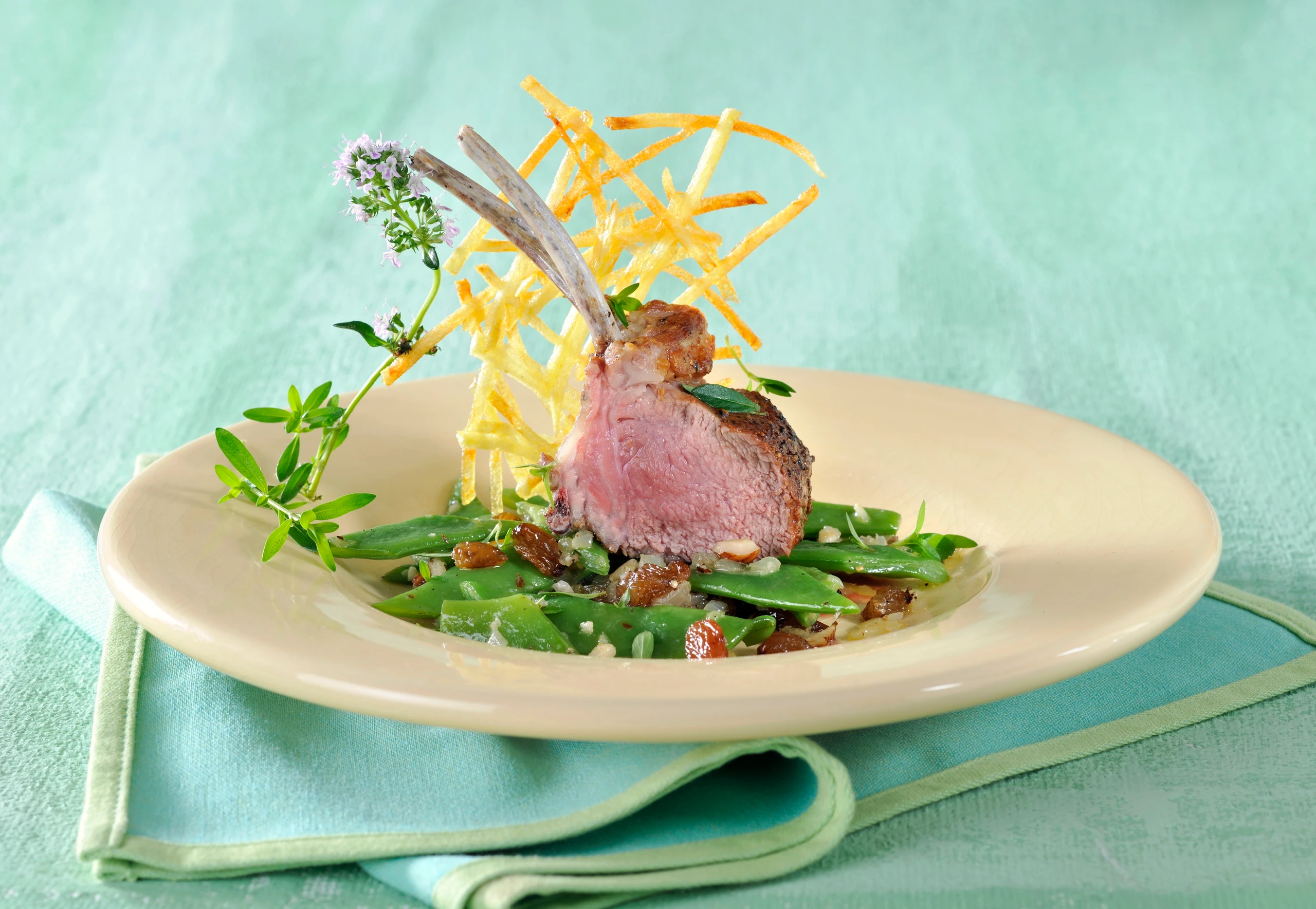 Breite Fisolen mit Walnüssen, Lammkrone und Erdäpfelgitter