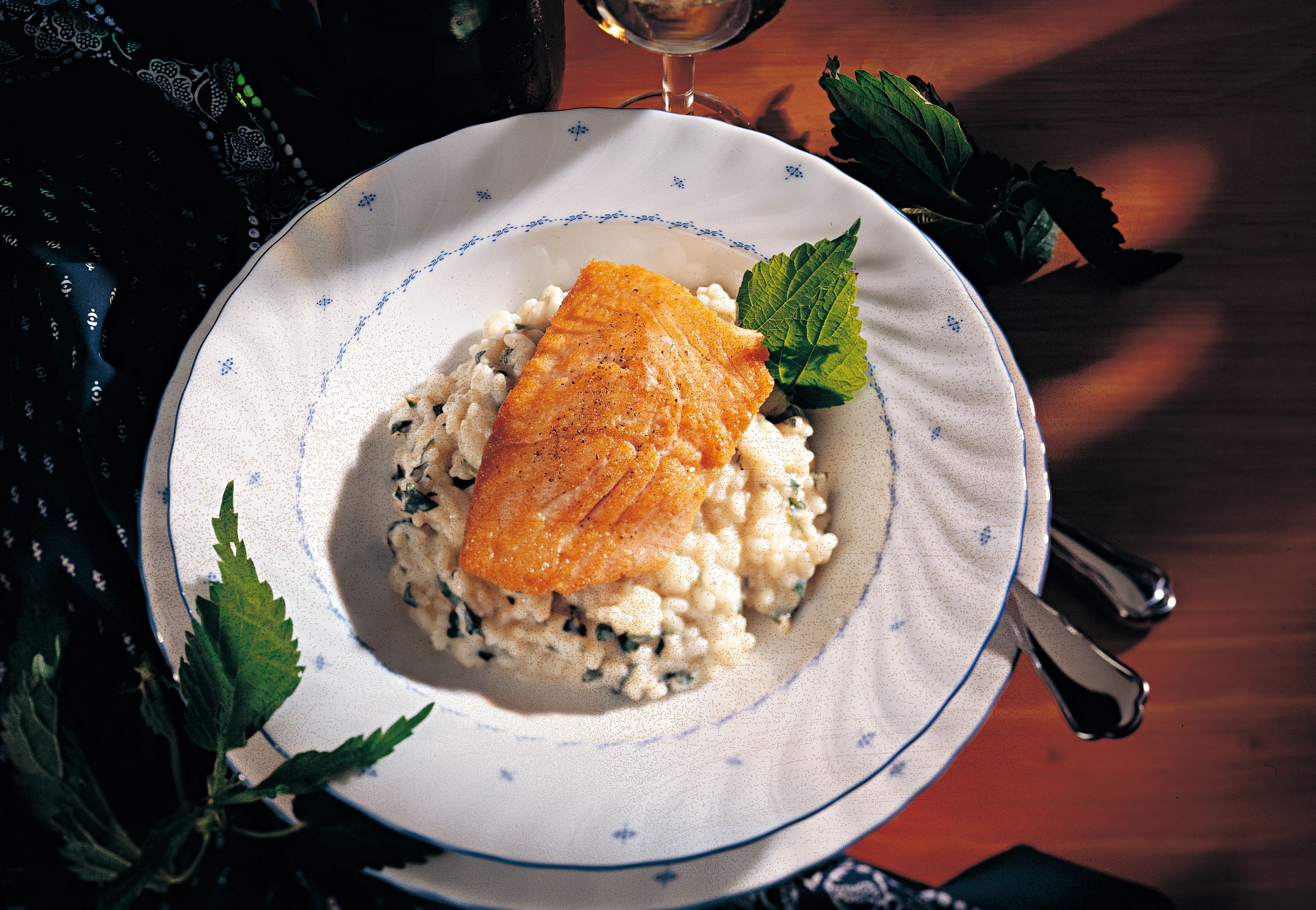 Brennnessel-Risotto mit gebratenem Frischlachs