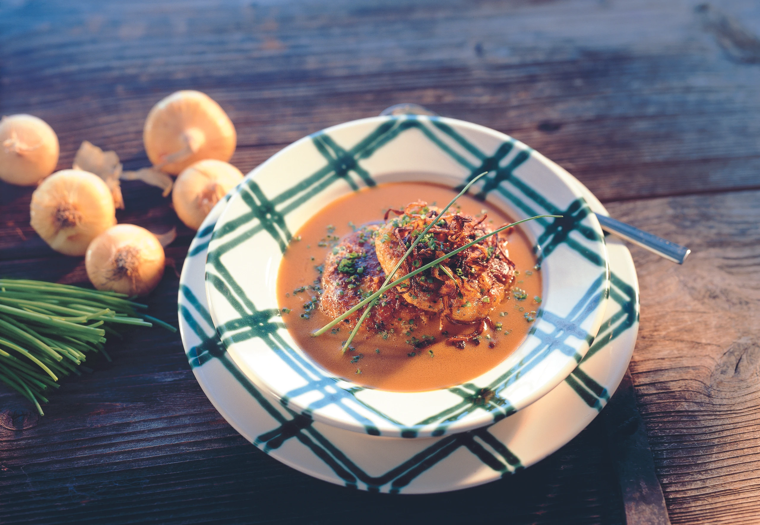 Zwiebel schälen, halbieren und quer in dünne Scheiben schneiden. Butter bis zum Aufschäumen erhitzen, Zwiebel darin unter Rühren goldbraun rösten. Mehl einrühren und braun rösten. Mit Wasser aufgießen und aufkochen. Suppe mit Salz und Pfeffer würzen, Lorbeerblatt zugeben. Suppe bei schwacher Hitze ca. 30 Minuten köcheln.
