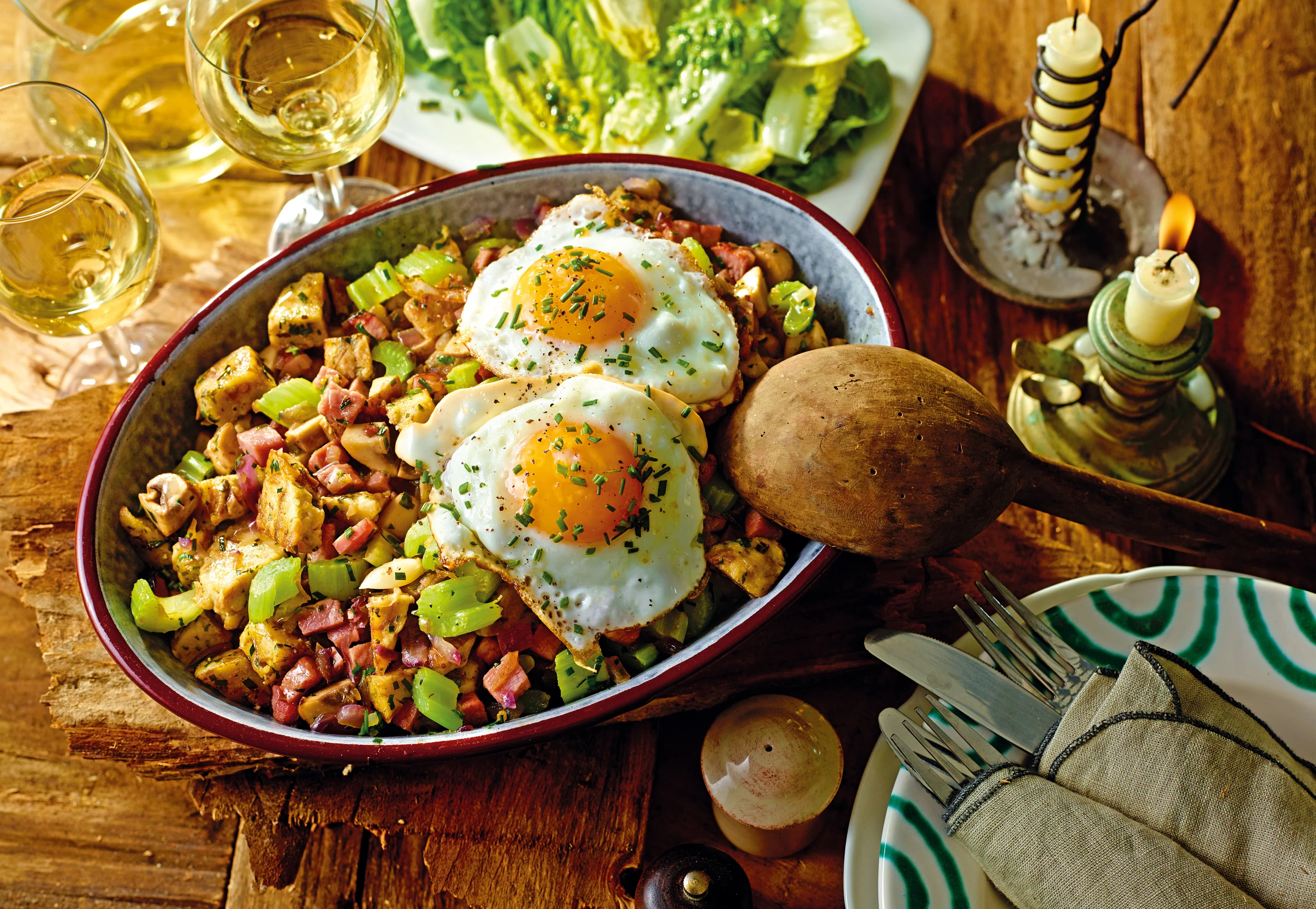 Für die Spiegeleier in einer beschichtete Pfanne Öl erhitzen. Eier vorsichtig in die Pfanne schlagen und bei schwacher Hitze braten. Mit Salz und Pfeffer würzen. Salate mit der Marinade vermischen. Gröstl mit den Spiegeleiern anrichten, mit Schnittlauch bestreuen und mit grünem Salat servieren.