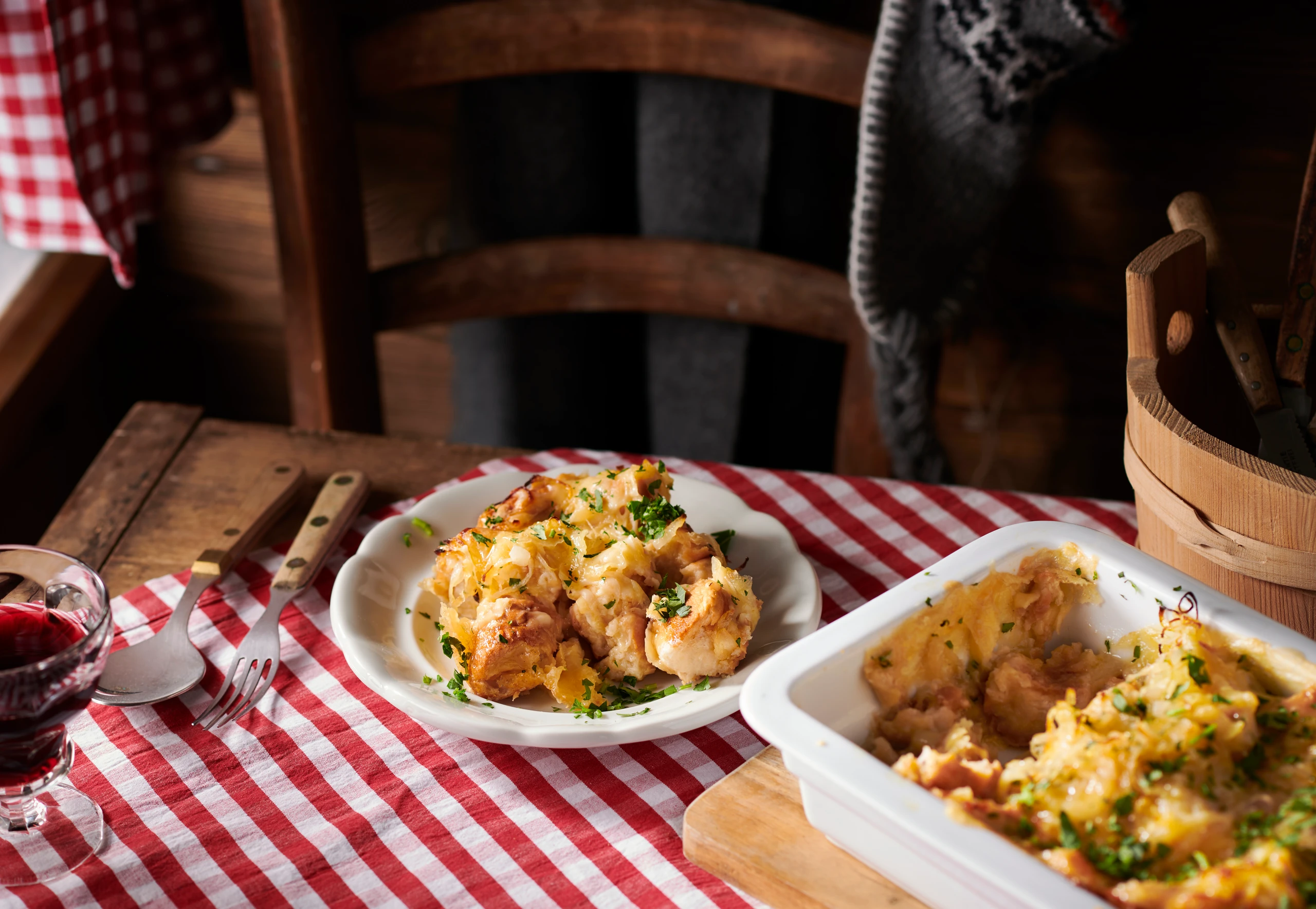 Zwiebeln schälen und in dünne Scheiben schneiden. Butter und Öl erhitzen, Zwiebeln darin anschwitzen. Emmentaler und Graukäse in kleine Würfel schneiden und vermischen. Mit Salz und Pfeffer wenig würzen.