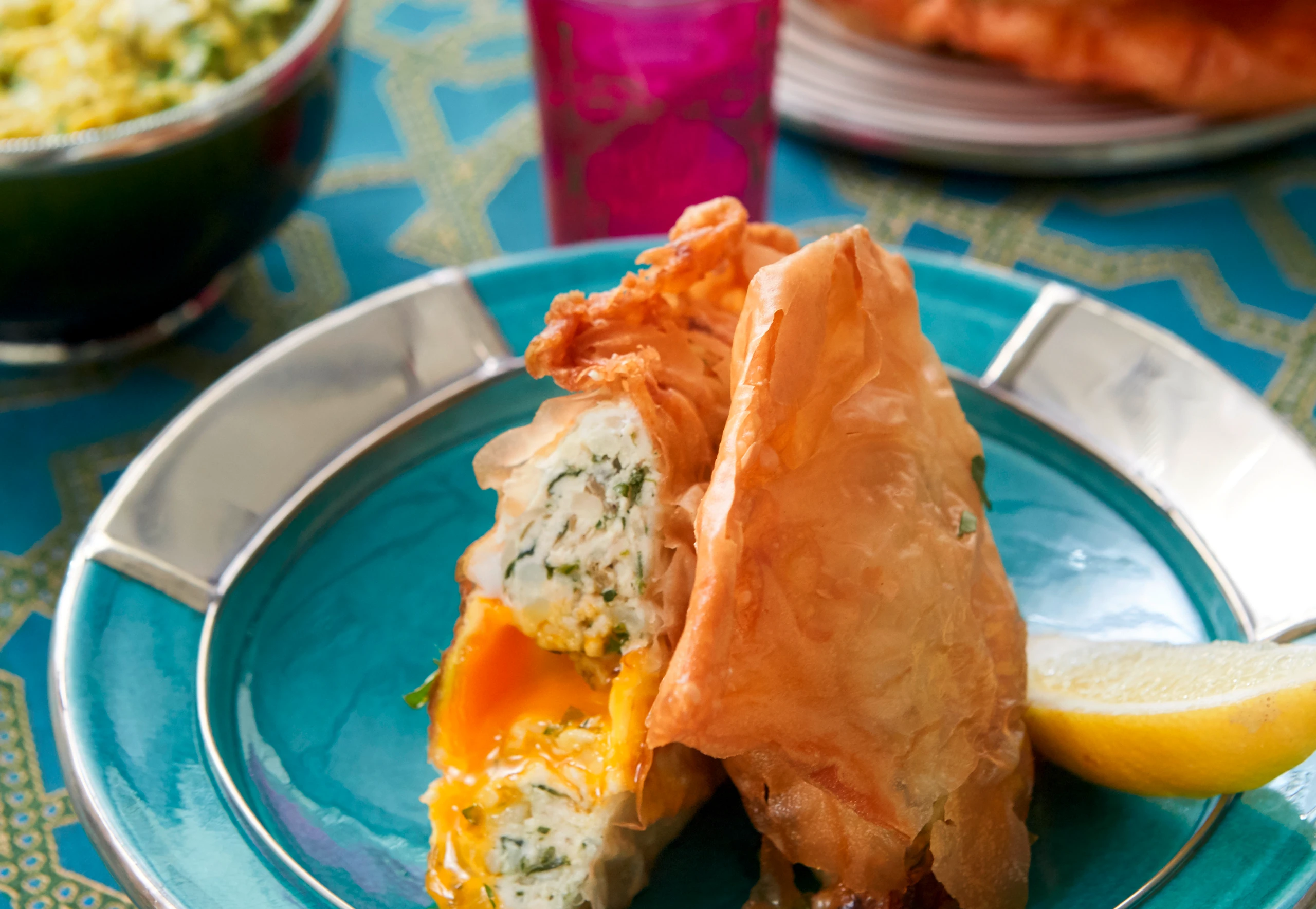 Teigblätter in ca. 25 cm große, runde Scheiben schneiden. Ein Stück von den Teigresten auf die rechte Seite jeder Scheibe legen. (Das verstärkt den Brick und verhindert, dass er aufreißt.) Darauf einen kleinen Kranz aus der Füllung formen. Ei in den Kranz schlagen. Teigblatt am Rand leicht anfeuchten und übereinanderklappen, so dass ein Halbkreis entsteht. Übrige Teigblätter ebenso füllen.
