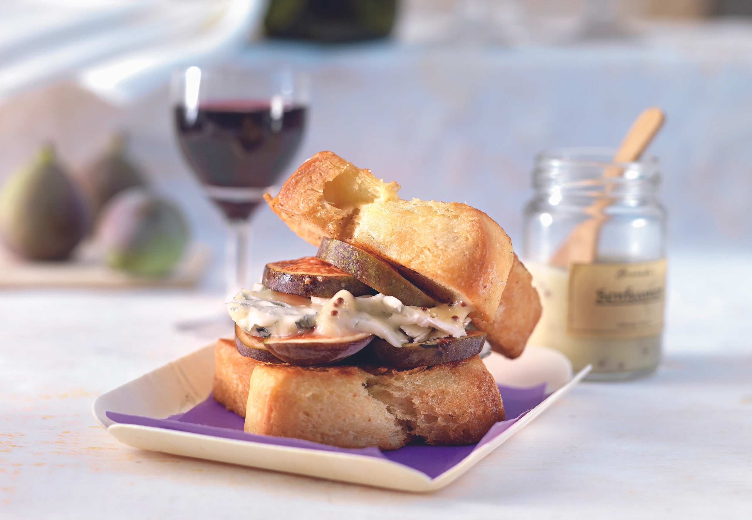 Briochescheiben mit Feigen und Käse belegen, mit Mostarda garnieren und mit einer Briochescheibe bedecken.