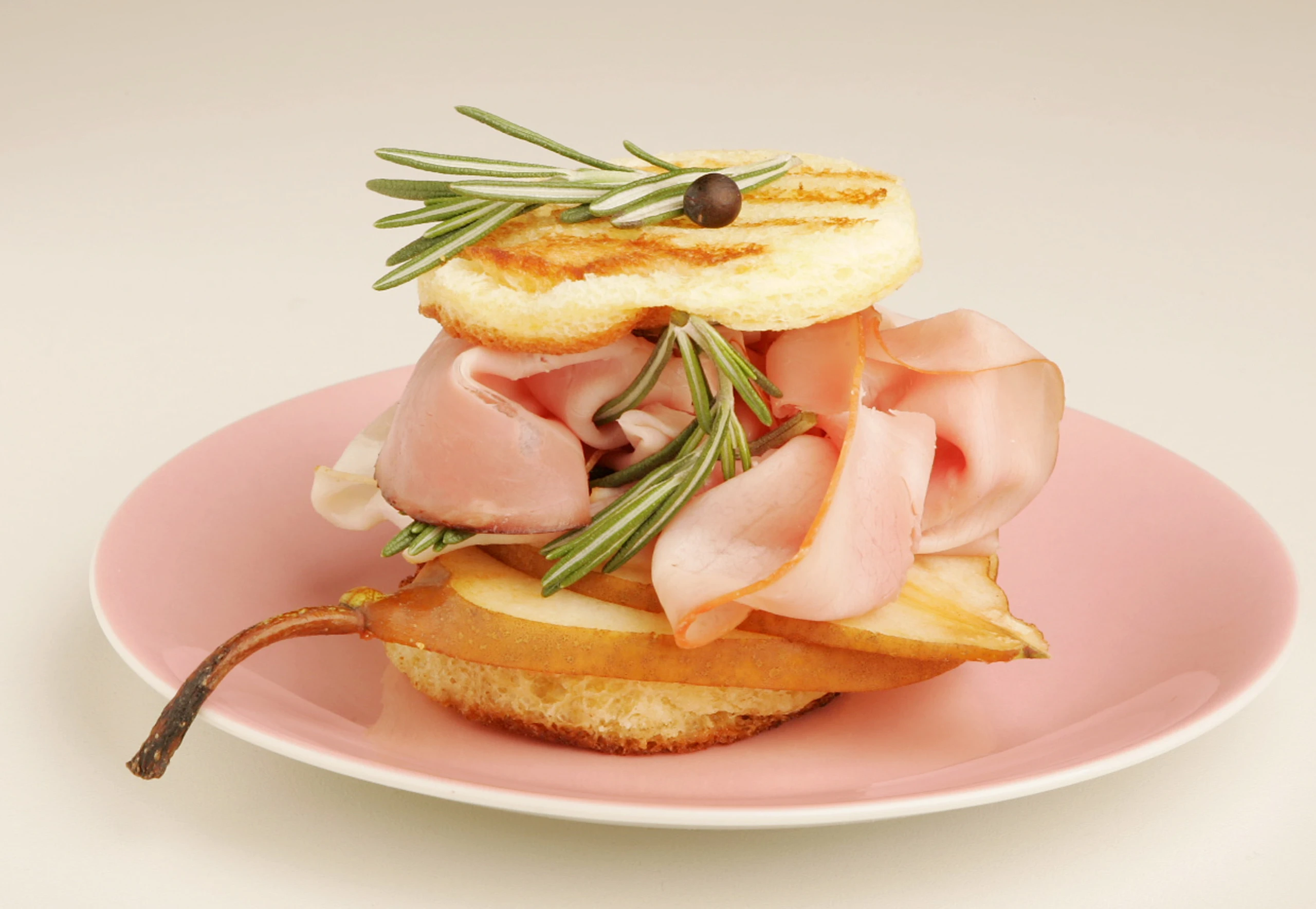 Wacholderbeeren fein hacken. 4 Briochescheiben mit Birnen und Schinken belegen, mit Wacholder und einigen Rosmarinnadeln bestreuen. Übrige Scheiben darauf legen, mit Rosmarin garnieren.