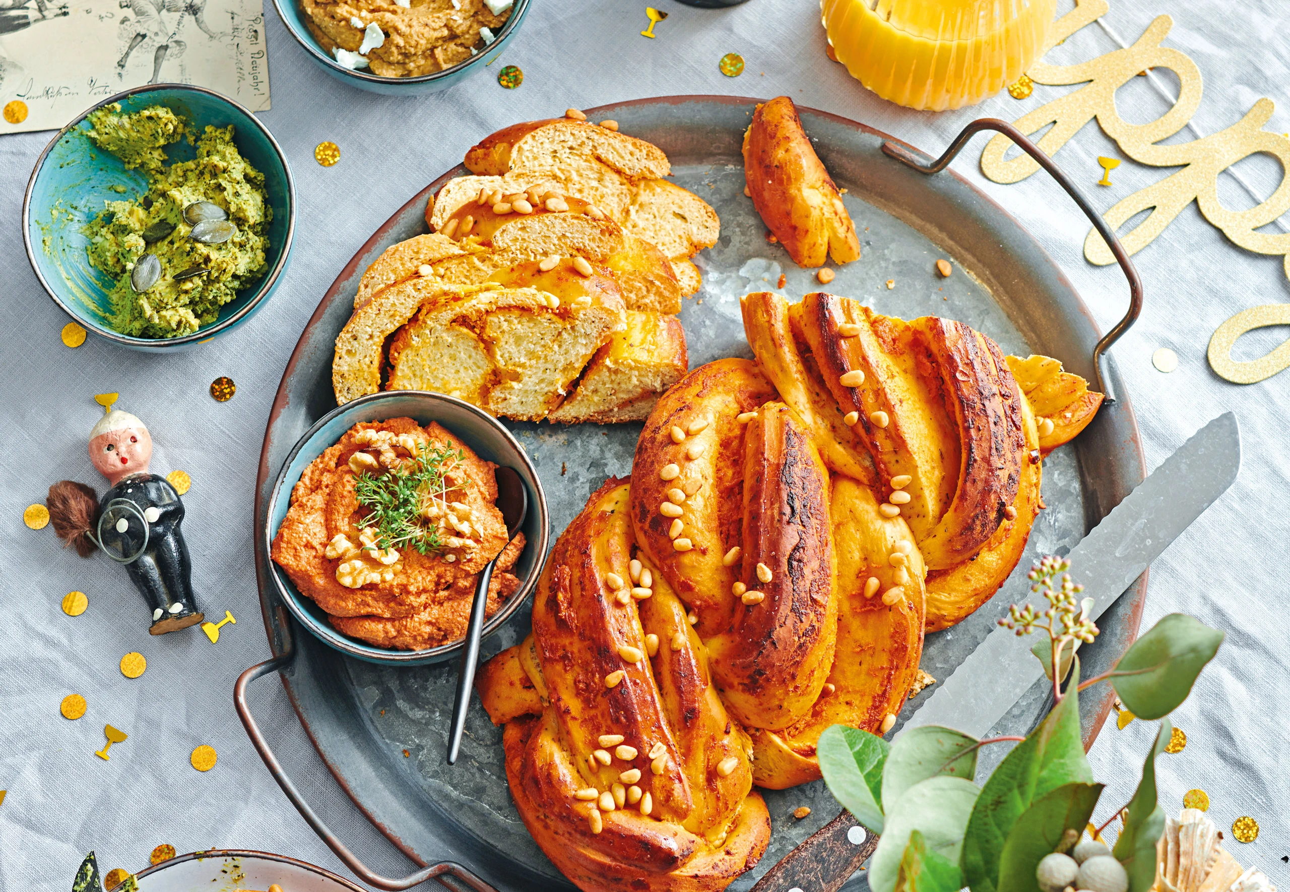 Teig auf einer leicht bemehlten Arbeitsfläche ausrollen (40 x 60 cm) und mit Pesto bestreichen. Teig von unten nach oben eng einrollen. Teigrolle der Länge nach halbieren und zu einem Zopf eindrehen. Darauf achten, dass die Schnittfläche oben ist. Zopf auf ein mit Backpapier belegtes Blech legen, locker mit Frischhaltefolie abdecken und an einem warmen Ort ca. 1 Stunde gehen lassen.