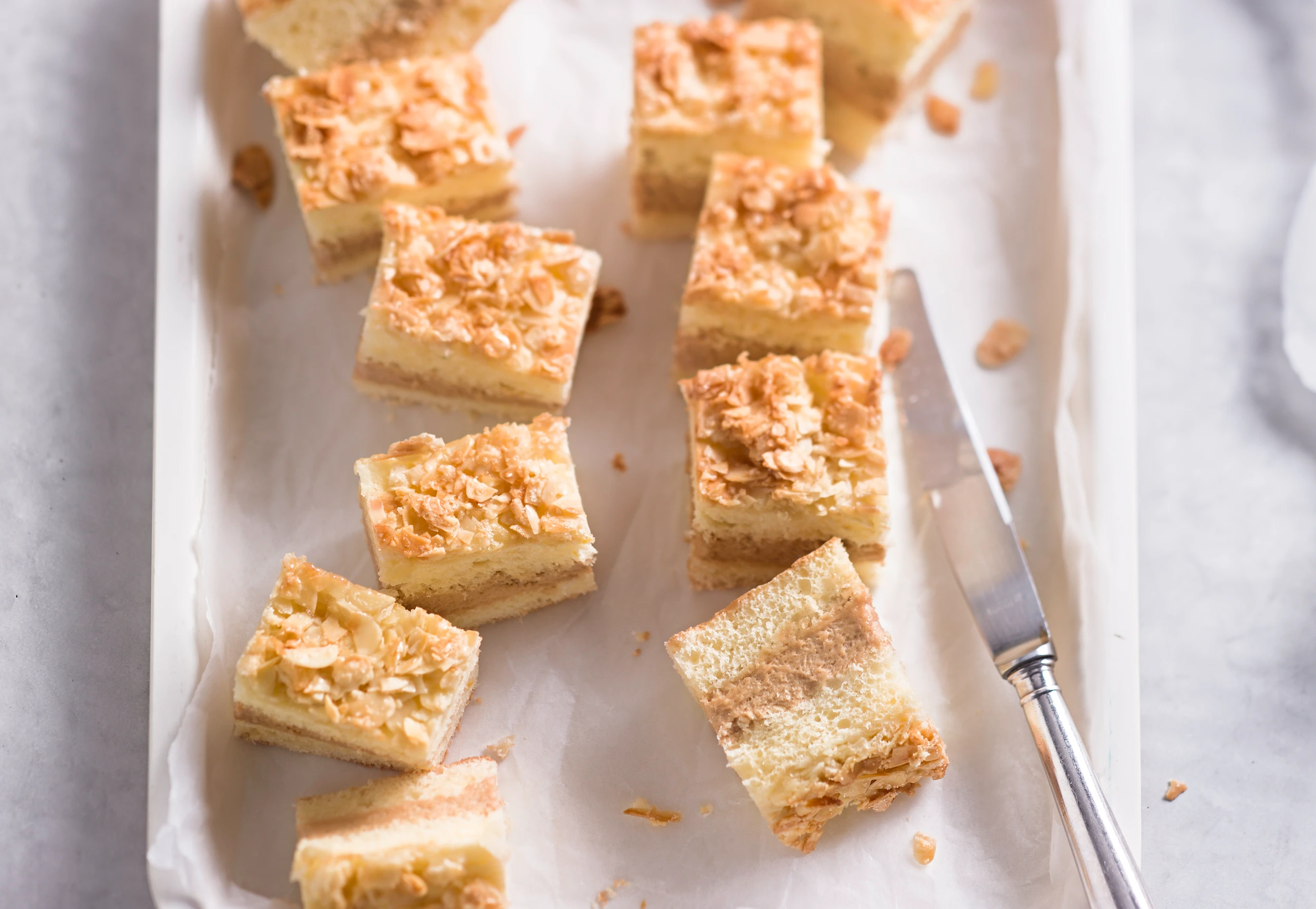 Für die Kruste Mandeln, Zucker und Eiklar vermischen. Teig auf einem Stück Backpapier ausrollen (30 x 40 cm). Papier auf ein Backblech ziehen, Teig mit der Mandelmischung bestreuen und ca. 1 Stunde rasten lassen.
