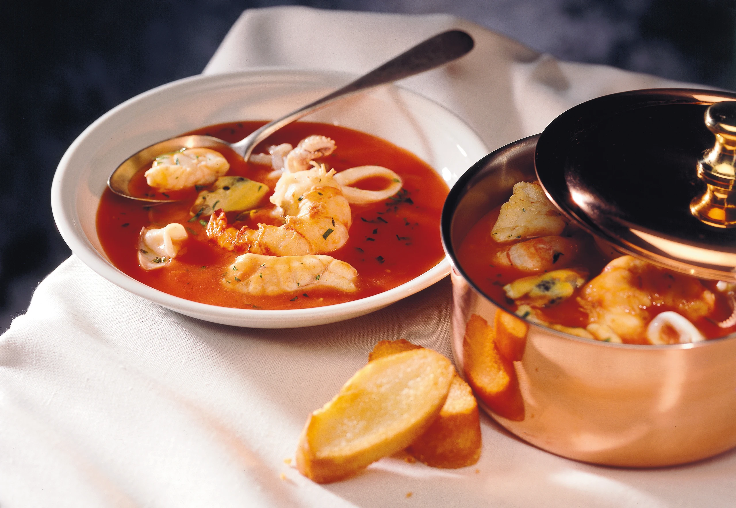 Fisch grob würfeln, Knorpel entfernen. Garnelen und Scampi auslösen, Muscheln und Tintenfische putzen.