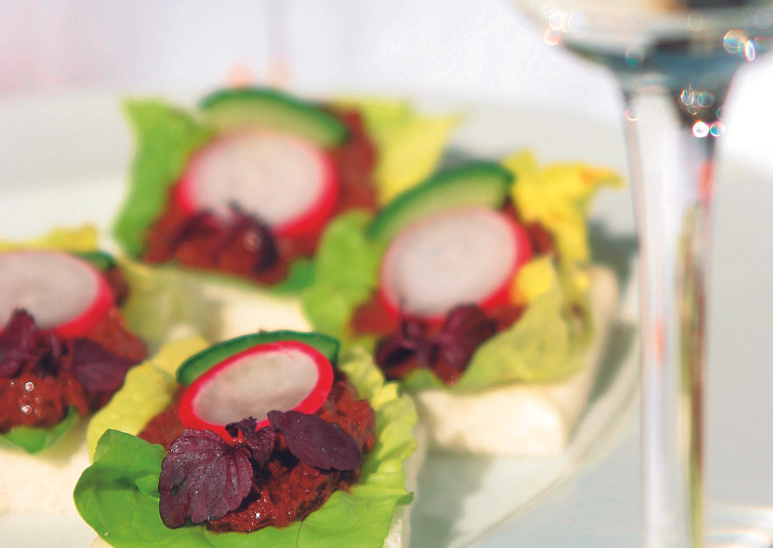 Brote in 12 gleich große Stücke schneiden, mit Salatblättern belegen, mit Olivenmasse bestreichen und mit Radieschen- und Gurkenscheiben sowie Kresse garnieren.
