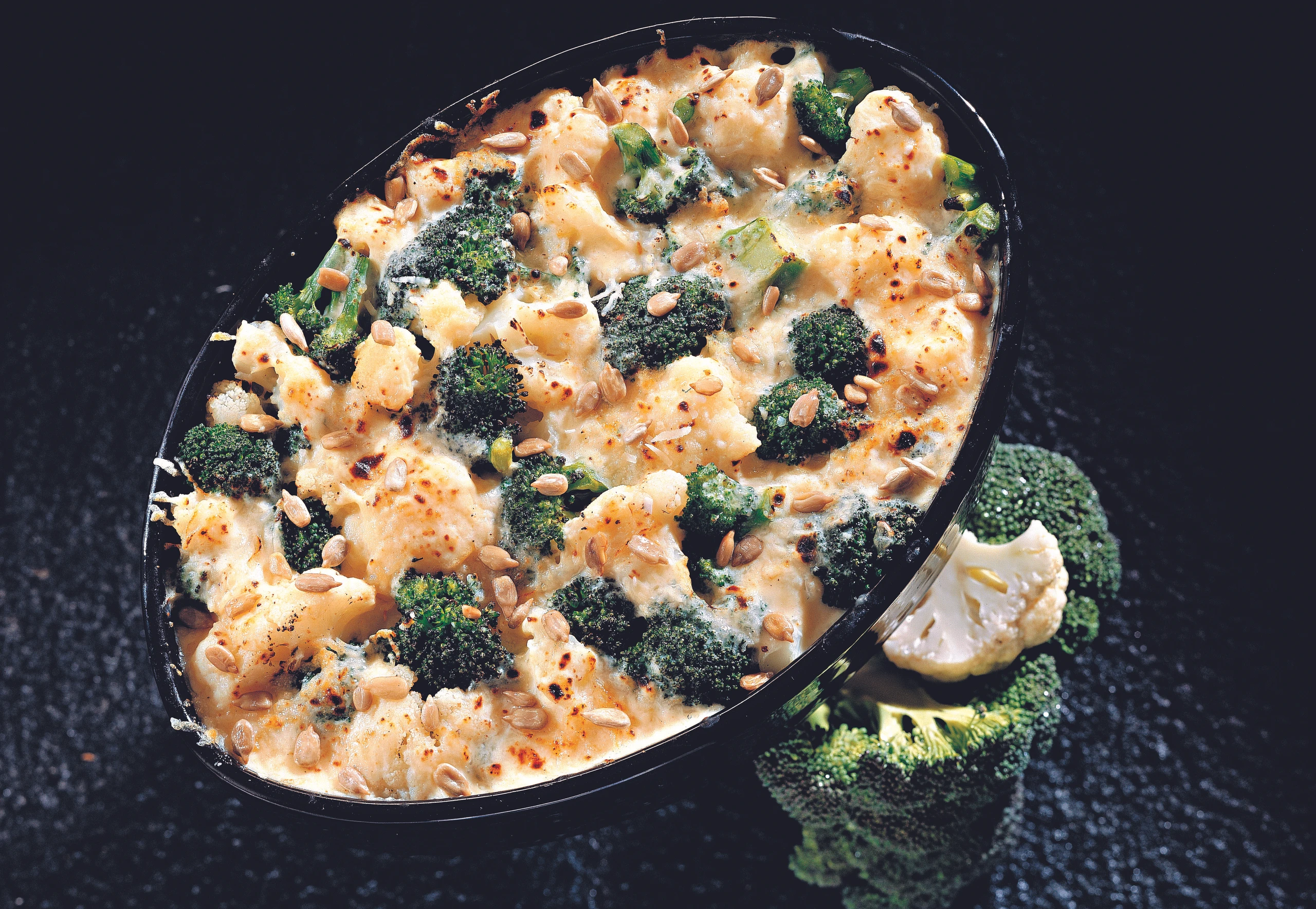 Sauce mit Dotter und Käse verrühren und über das Gemüse gießen. Auflauf mit Sonnenblumenkernen bestreuen und im vorgeheizten Rohr (mittlere Schiene / Gitterrost) 20–25 Minuten backen.